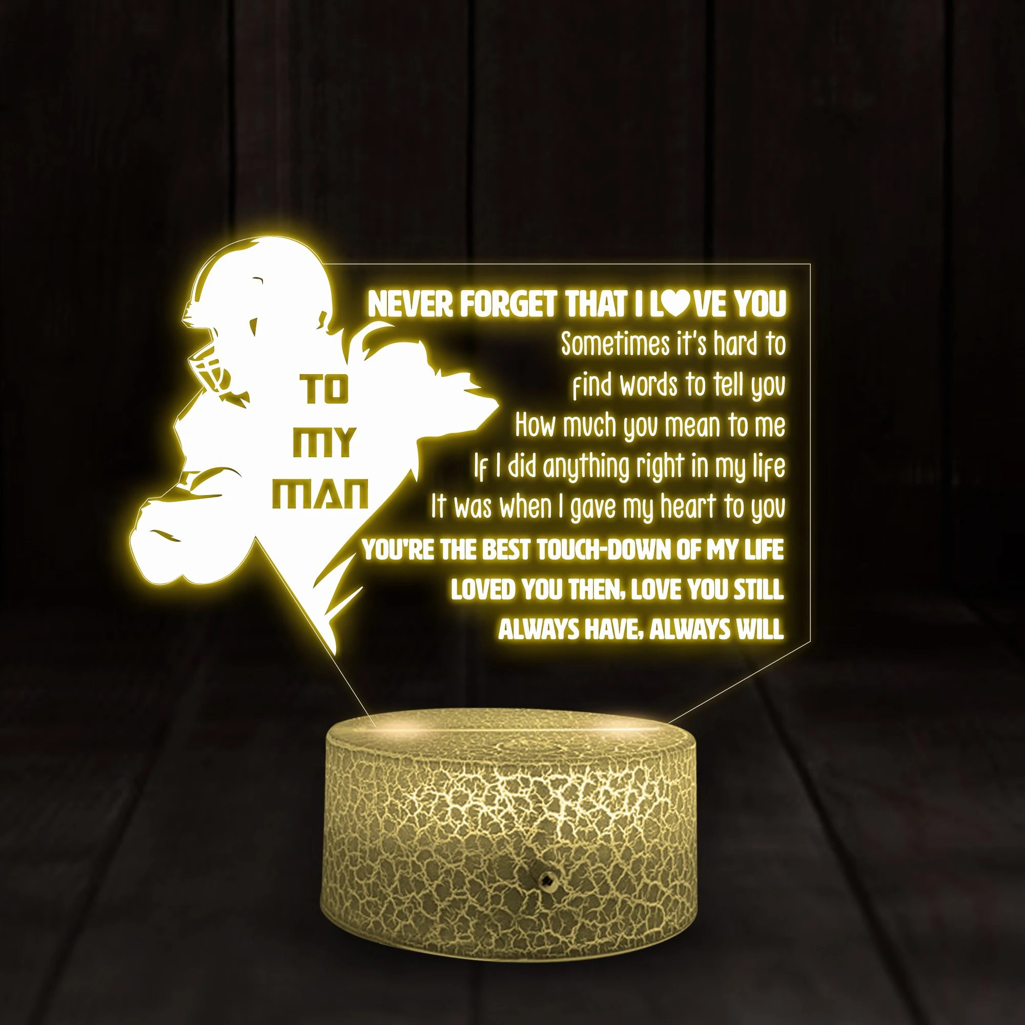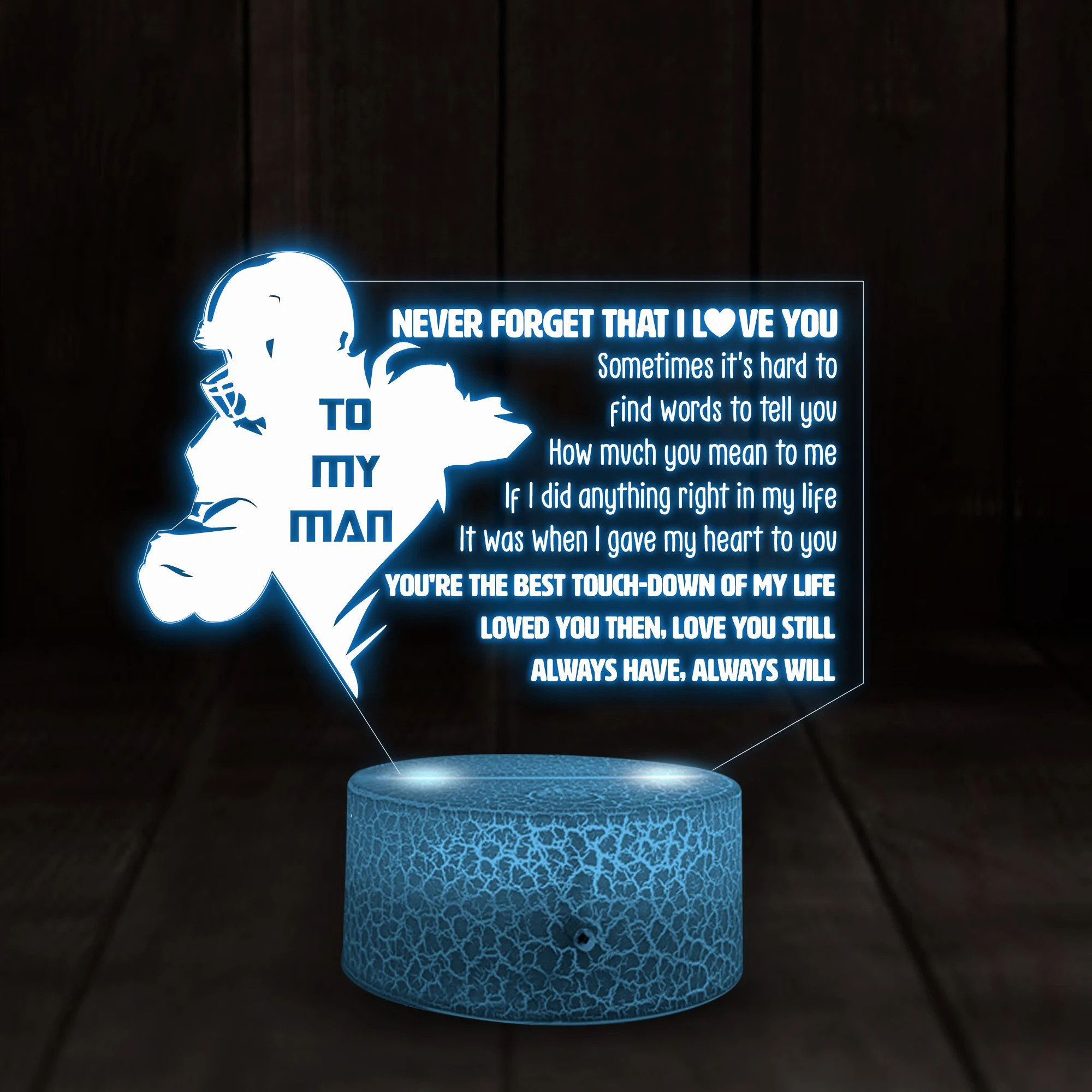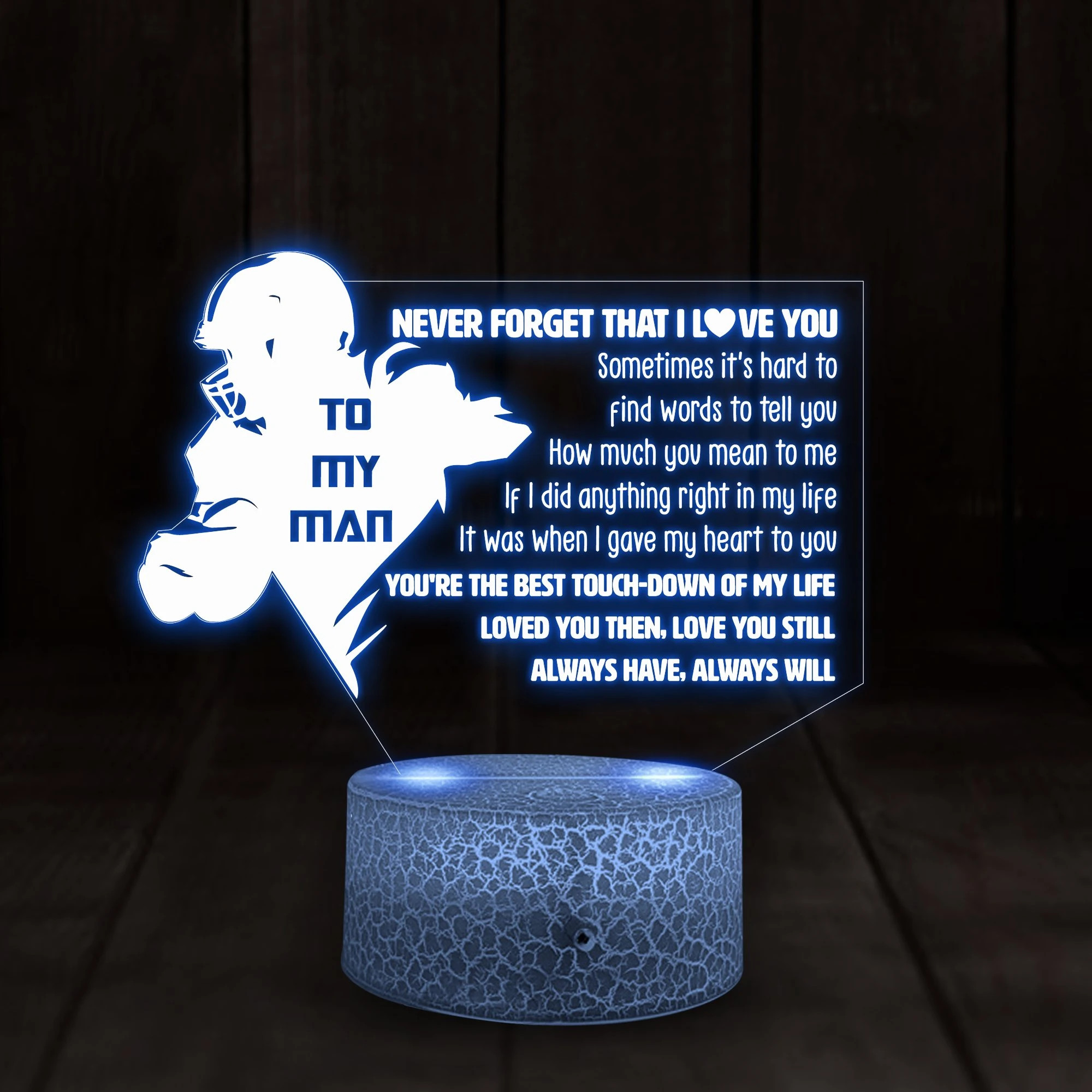 So whether you're looking to show off your own name or create a personalized gift for someone special, LateAndLow Store has got you covered. Start designing your own custom American Football Player Gift Love You Still 3D Illusion Night Light Led Light print-on-demand product today, and let us bring your vision to life!
