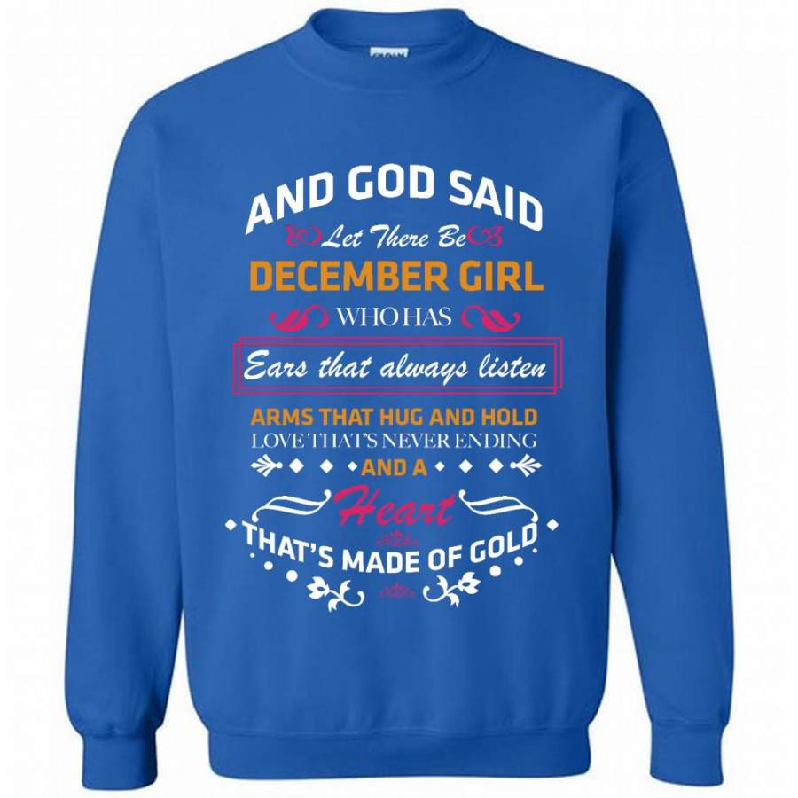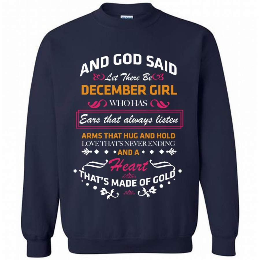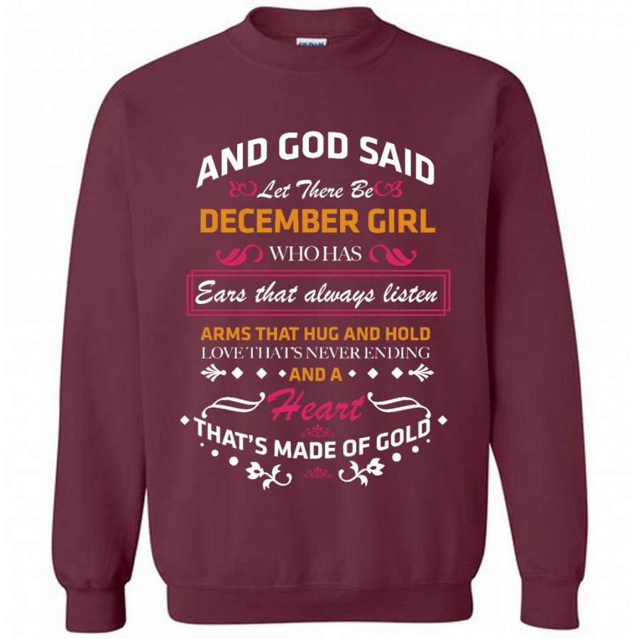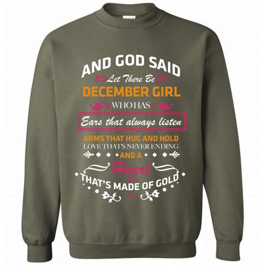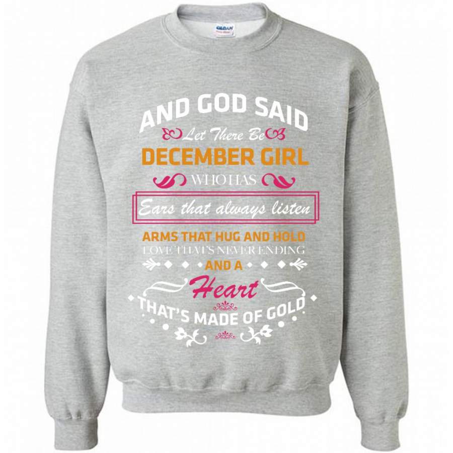 And God Said Let There Be December Girl Who Has Ears That Always Listen Arms That Hug And Hold Love That’s Never Ending And A Heart That’s Made Of Gold – Gildan Crewneck Sweatshirt