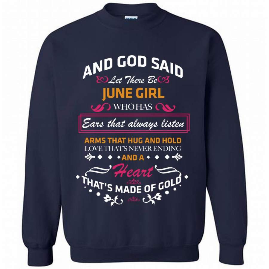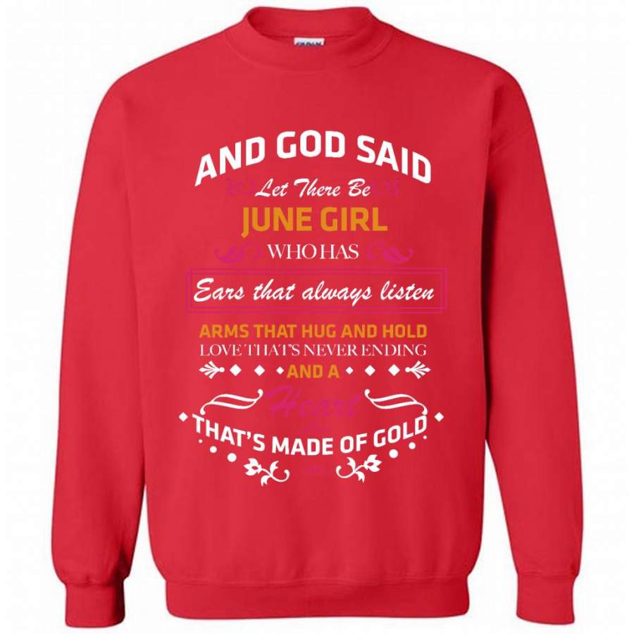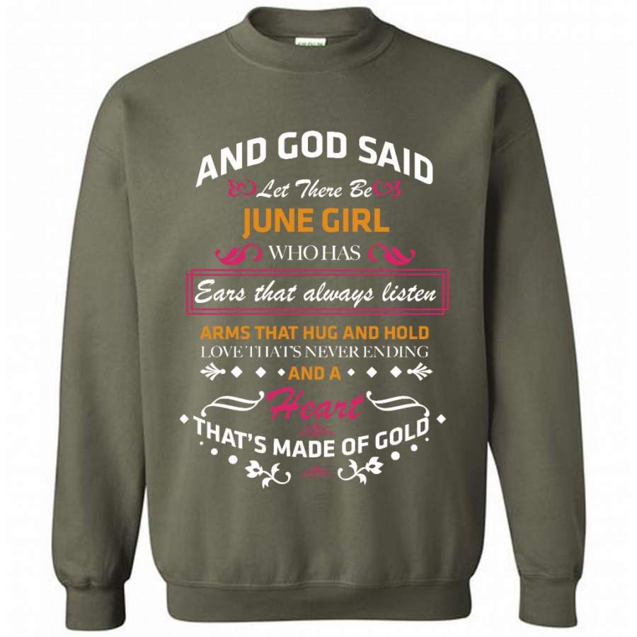And God Said Let There Be June Girl Who Has Ears That Always Listen Arms That Hug And Hold Love That’s Never Ending And A Heart That’s Made Of Gold – Gildan Crewneck Sweatshirt