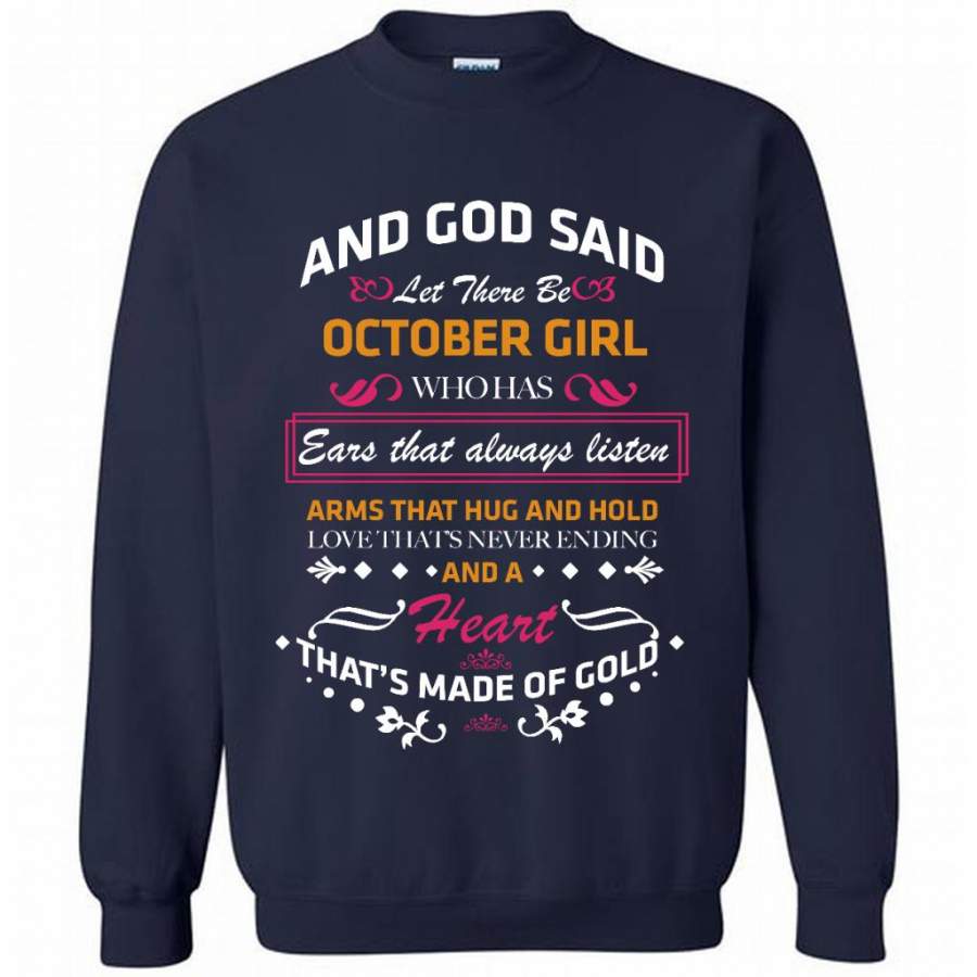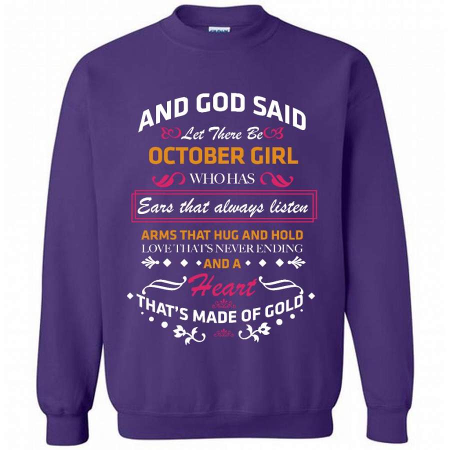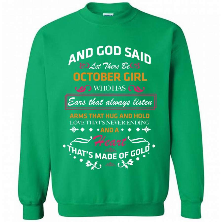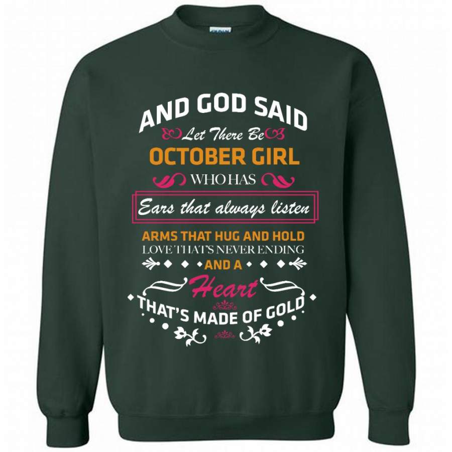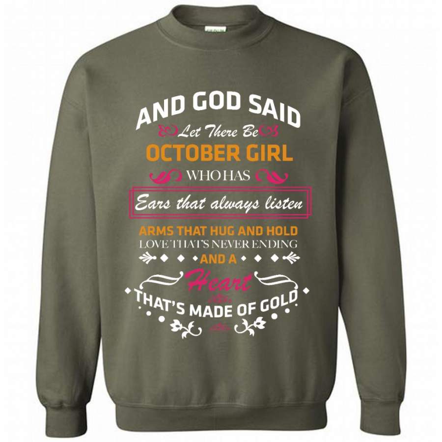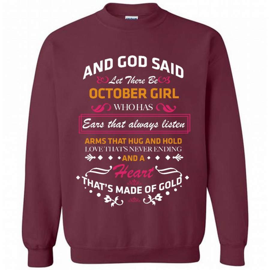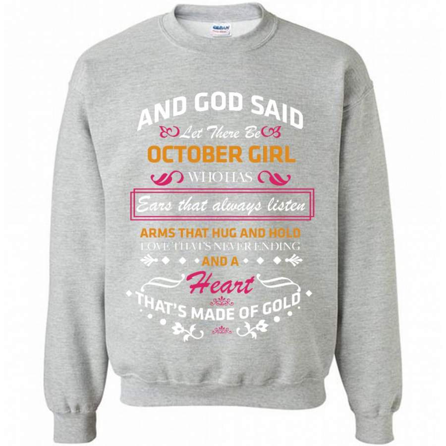 And God Said Let There Be October Girl Who Has Ears That Always Listen Arms That Hug And Hold Love That’s Never Ending And A Heart That’s Made Of Gold – Gildan Crewneck Sweatshirt