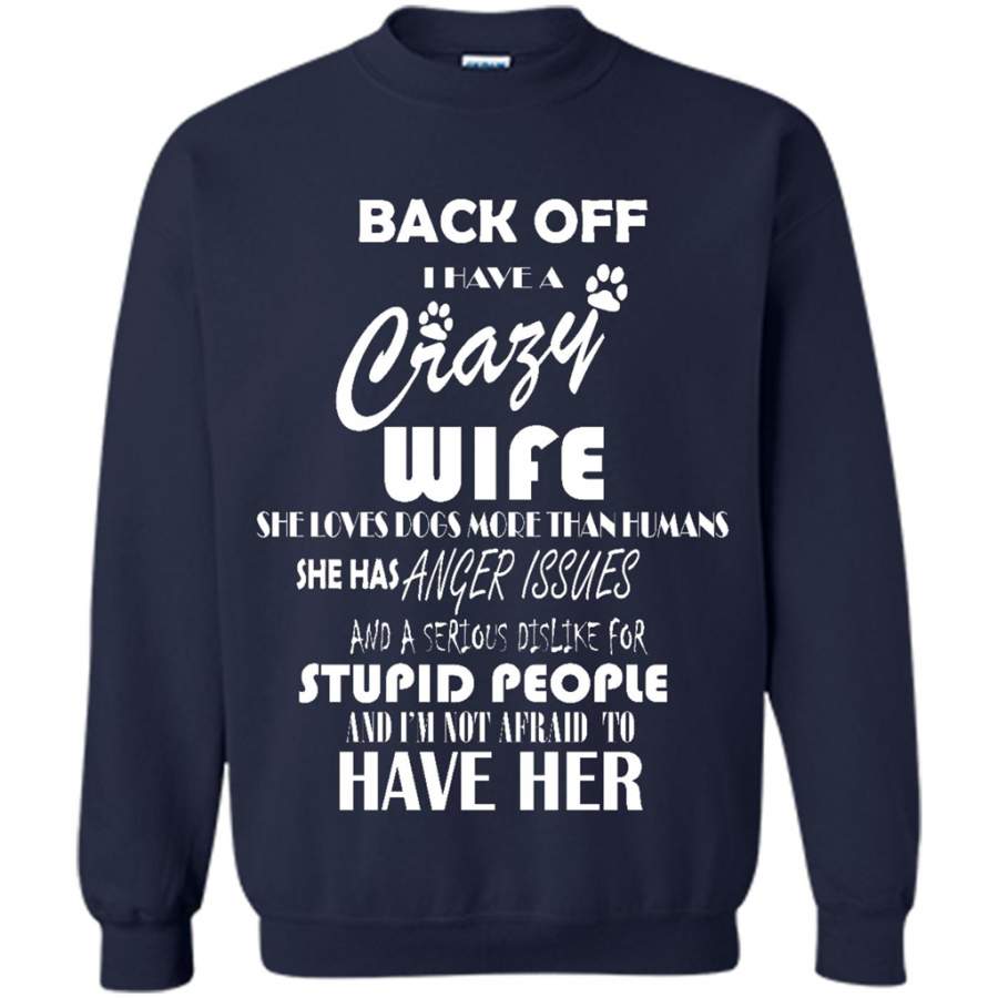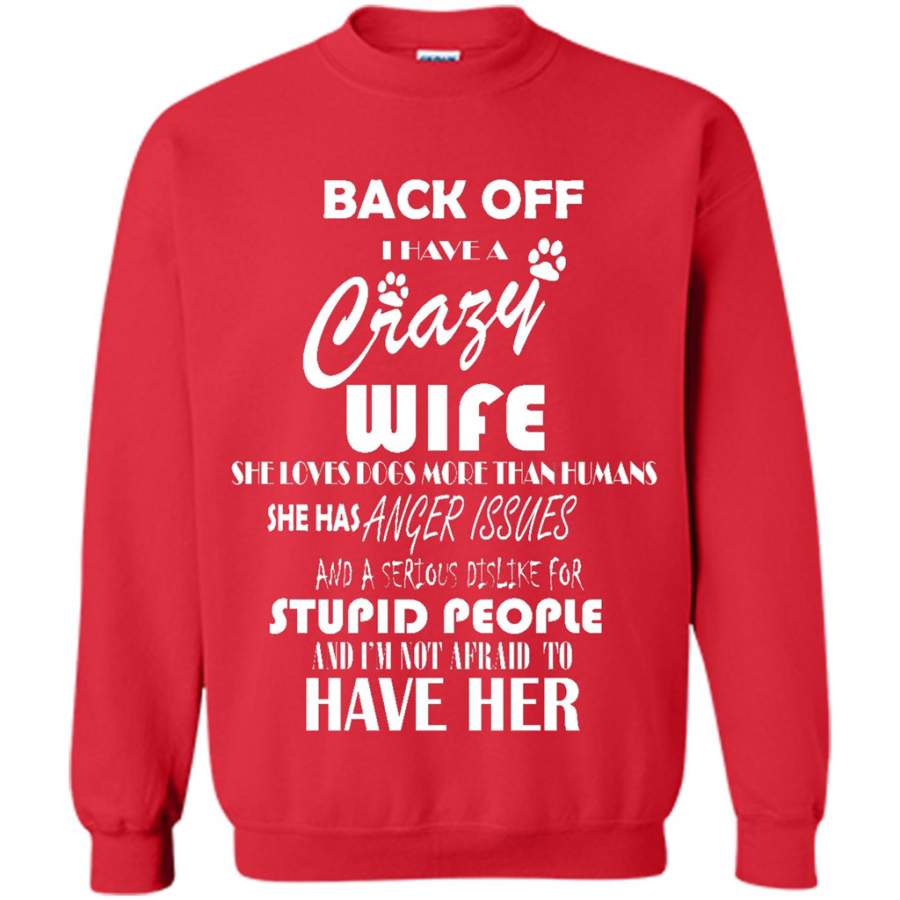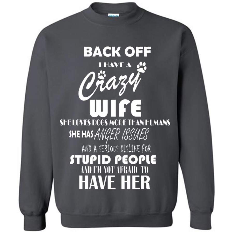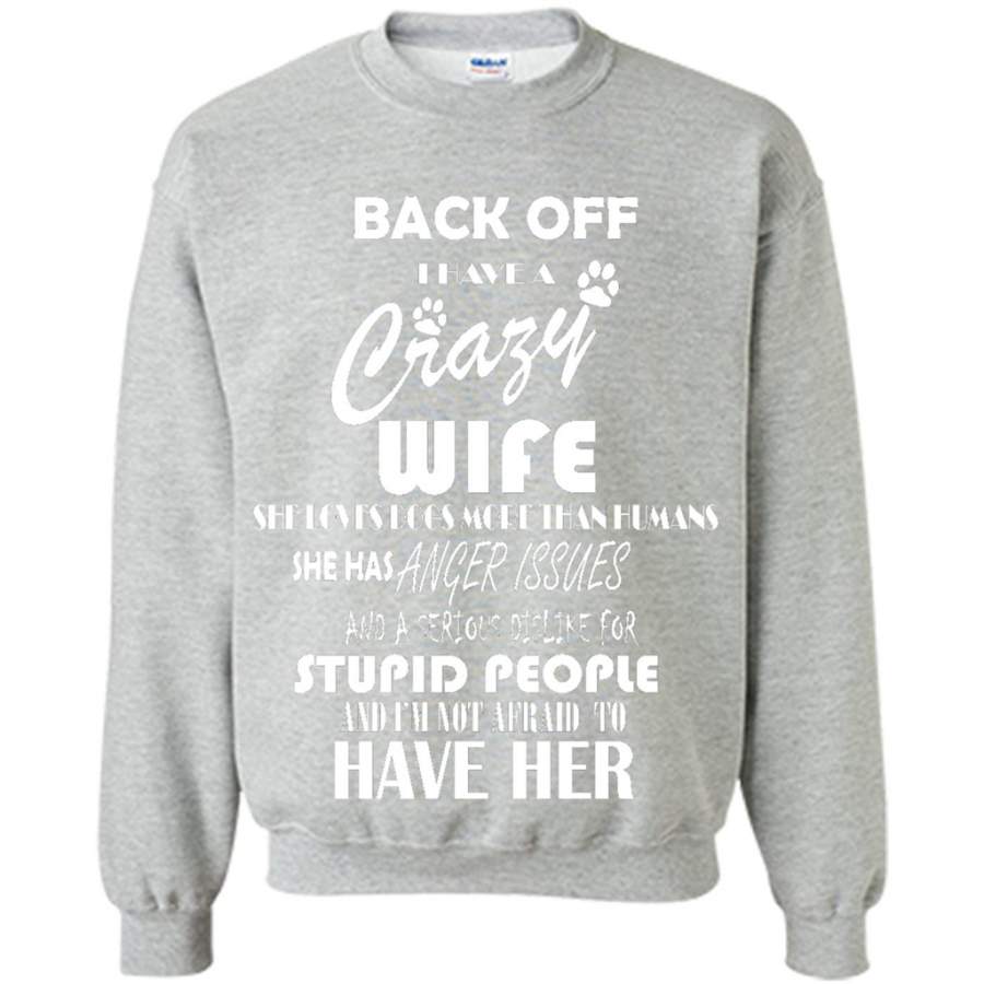 Back Off I Have A Crazy Wife She Loves Dogs More Than Humans She Has Anger Issues And A Serious Dislike For Stupid People And I’m Not Afraid To Have Her – Gildan Crewneck Sweatshirt