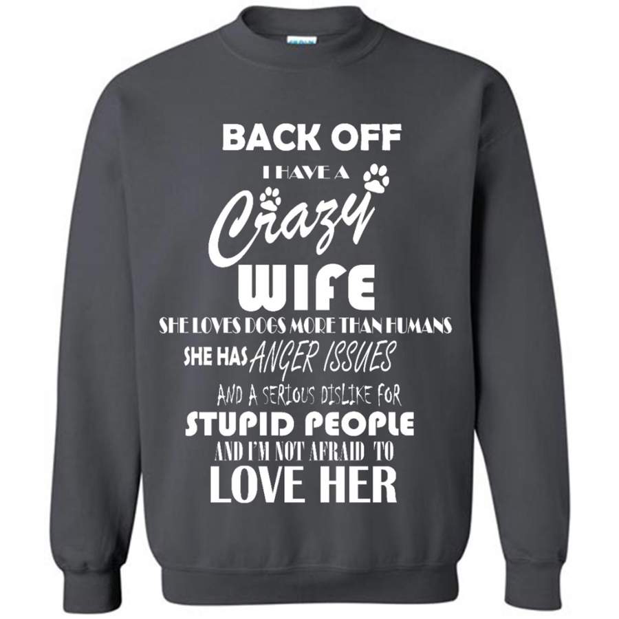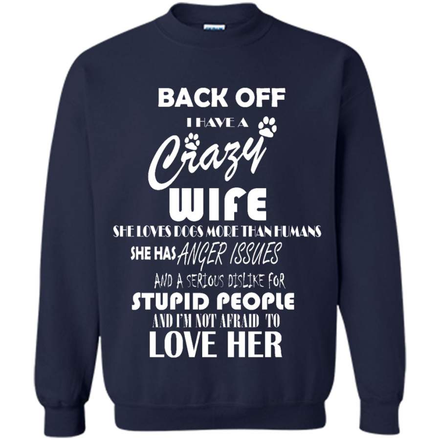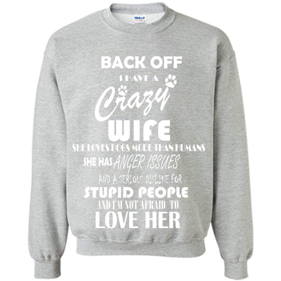 Back Off I Have A Crazy Wife She Loves Dogs More Than Humans She Has Anger Issues And A Serious Dislike For Stupid People And I’m Not Afraid To Love Her – Gildan Crewneck Sweatshirt