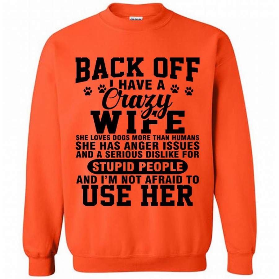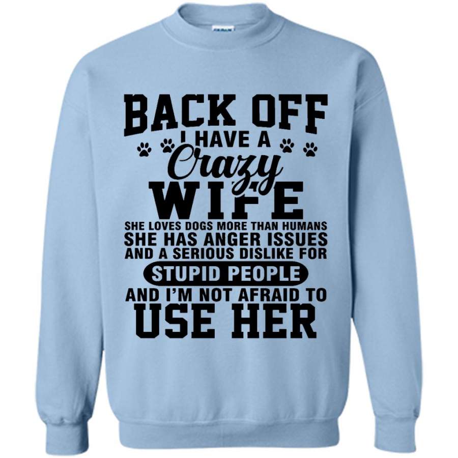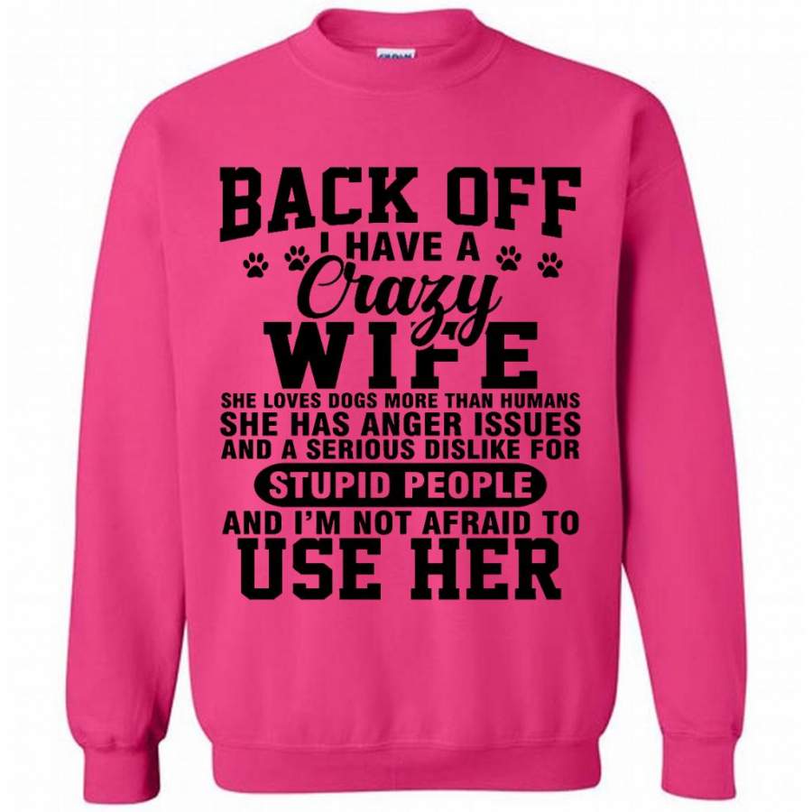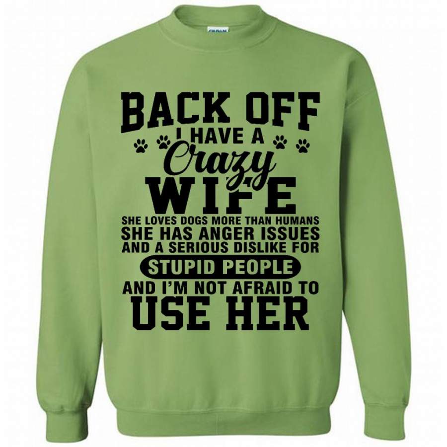 Back Off I Have A Crazy Wife She Loves Dogs More Than Humans She Has Anger Issues And A Serious Dislike For Stupid People And I’m Not Afraid To Use Her (w) – Gildan Crewneck Sweatshirt