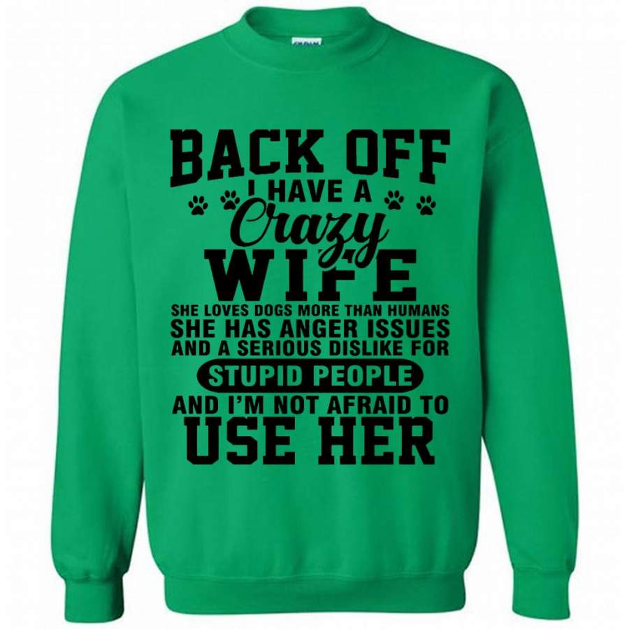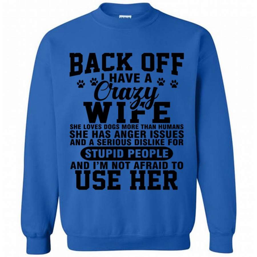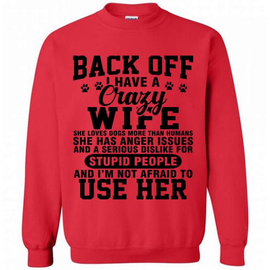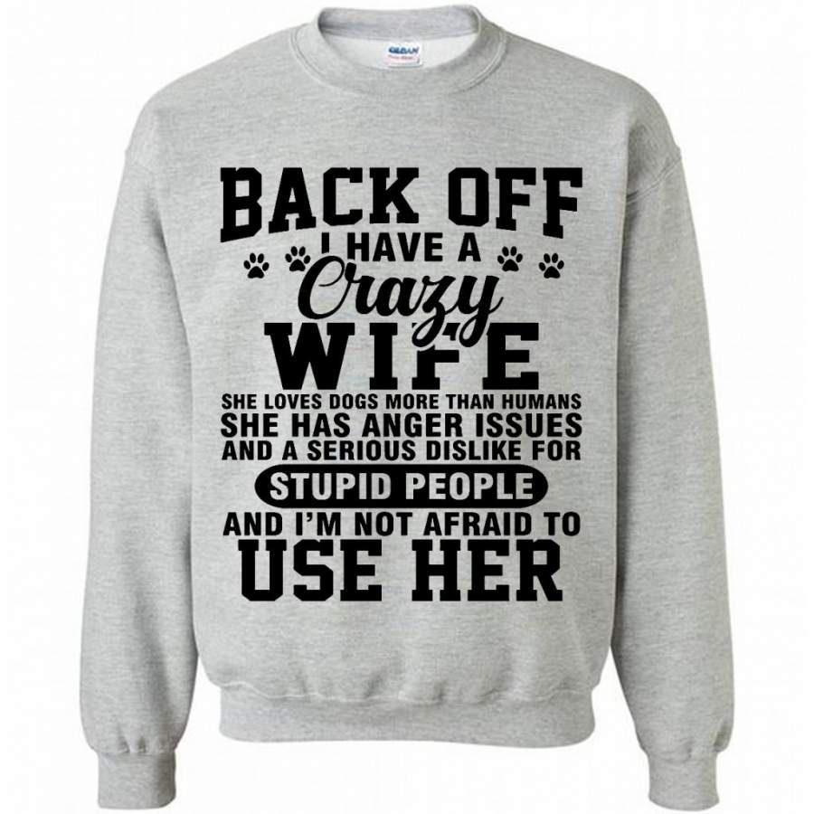 Back Off I Have A Crazy Wife She Loves Dogs More Than Humans She Has Anger Issues And A Serious Dislike For Stupid People And I’m Not Afraid To Use Her (w) – Gildan Crewneck Sweatshirt
