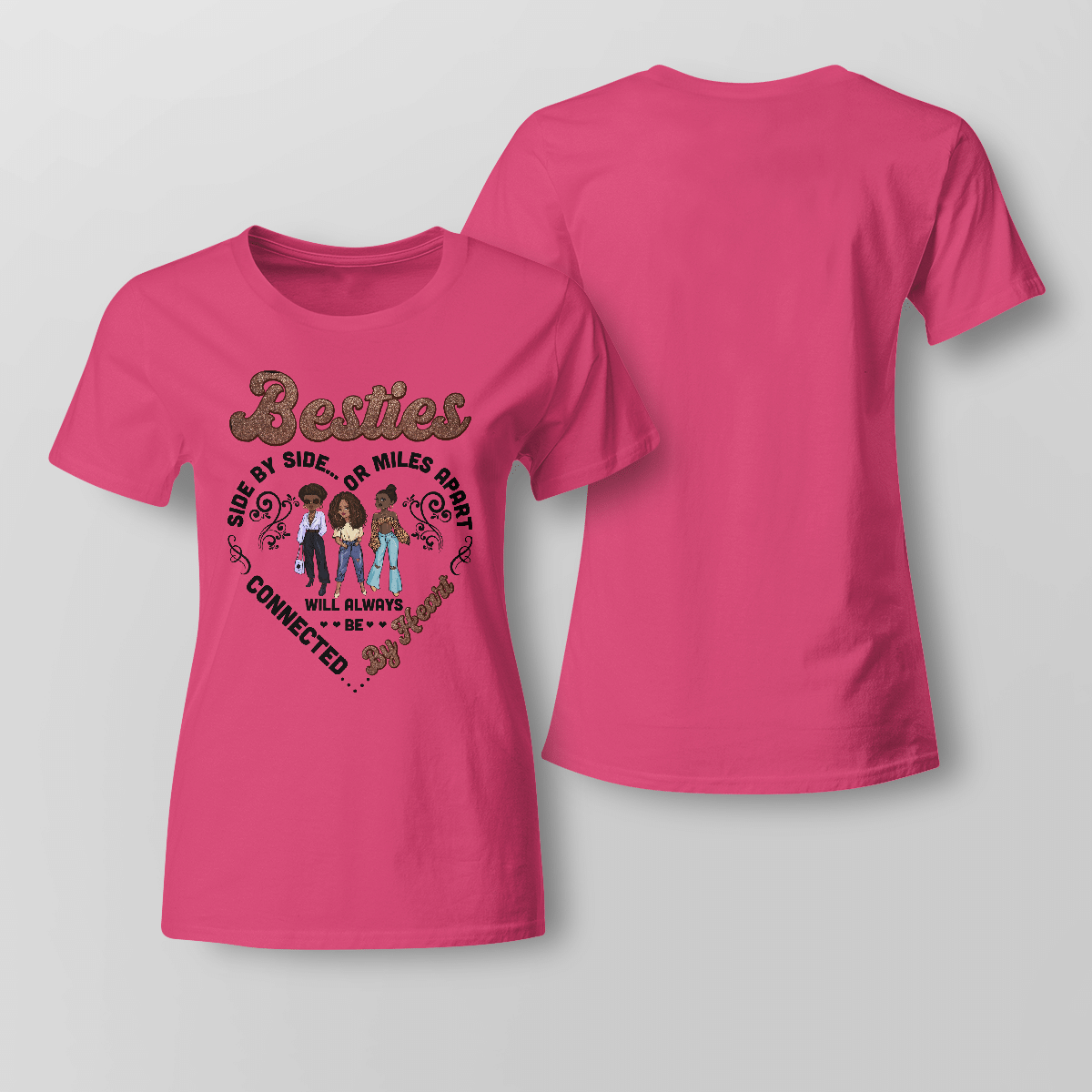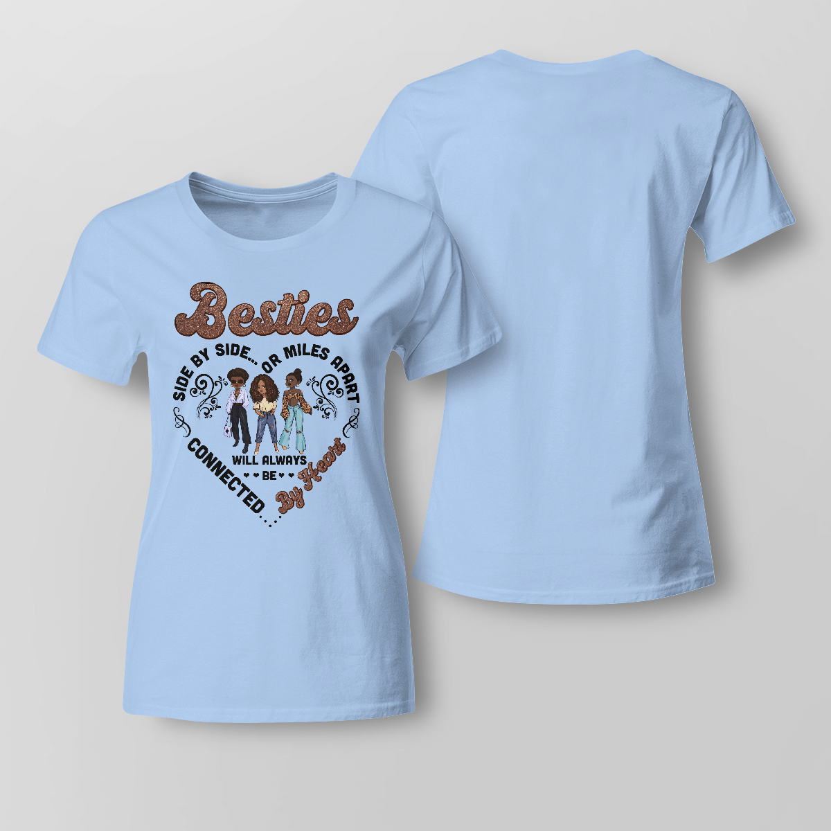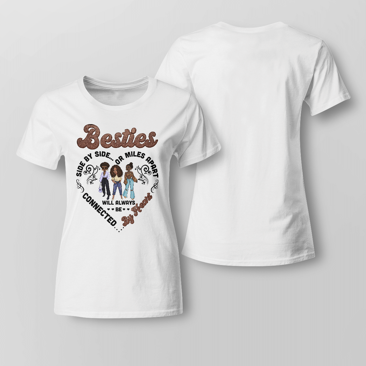 Our print-on-demand products are made with the highest quality materials, ensuring that your personalized Besties Shirt For Sister Friends Shirts Side By Side Ormiles Apart Bestie Will Always Be Connected By Heart Tshirt design looks great and feels comfortable. You can wear your new custom product with pride or give it as a unique and memorable gift that will be cherished for years to come.