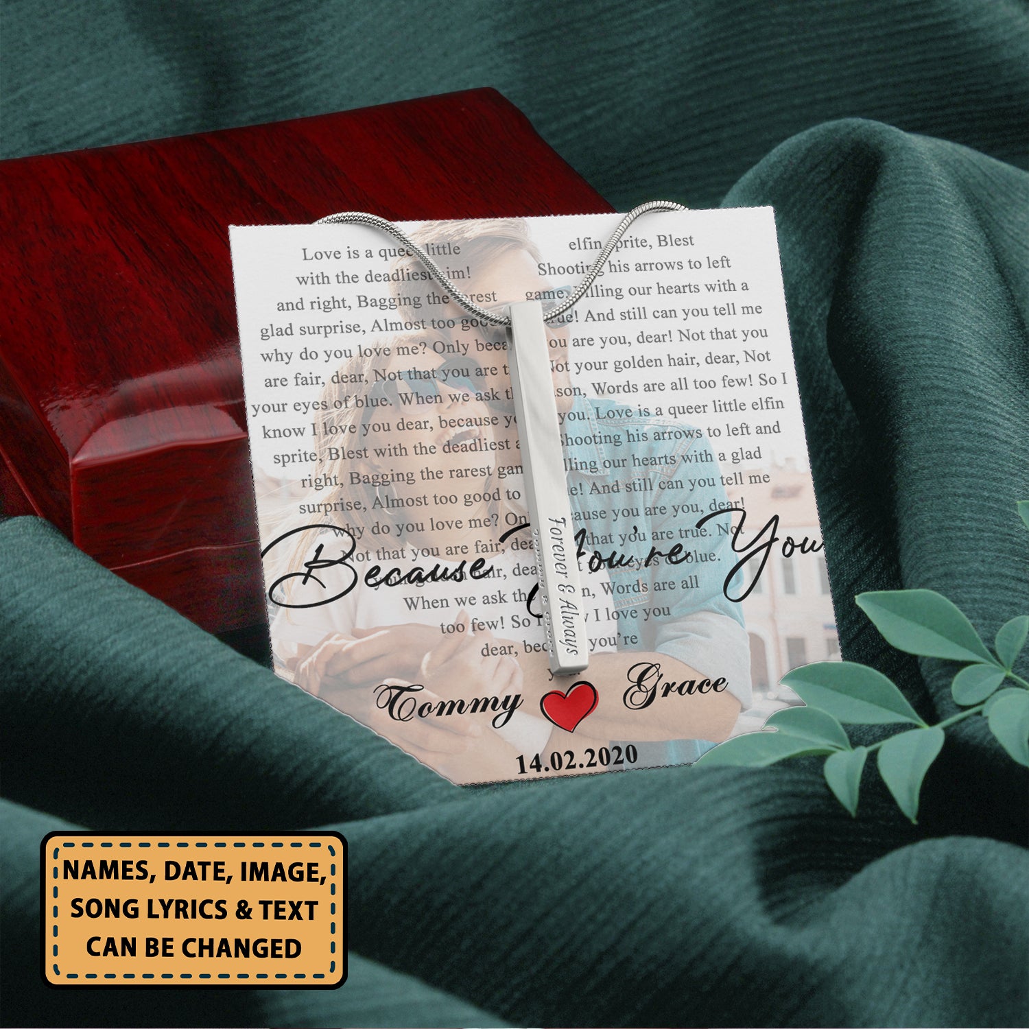 So whether you're looking to show off your own name or create a personalized gift for someone special, LateAndLow Store has got you covered. Start designing your own custom Couple Because You’Re You Custom Song Lyrics 1 – Stainless Steel Vertical Bar Necklace Personalizedwitch For Husband From Wife print-on-demand product today, and let us bring your vision to life!