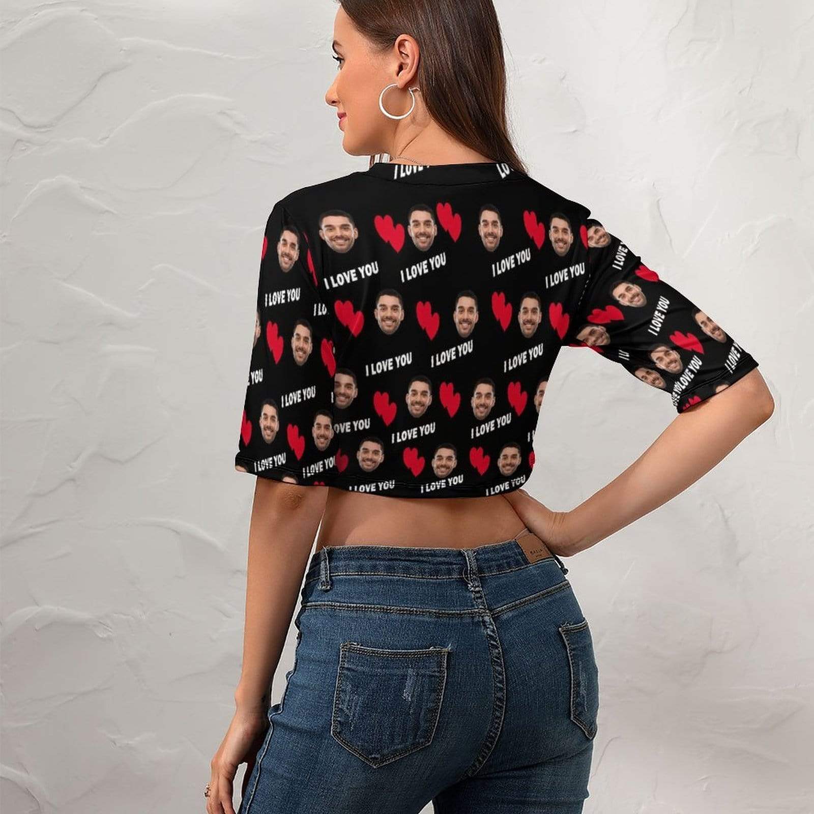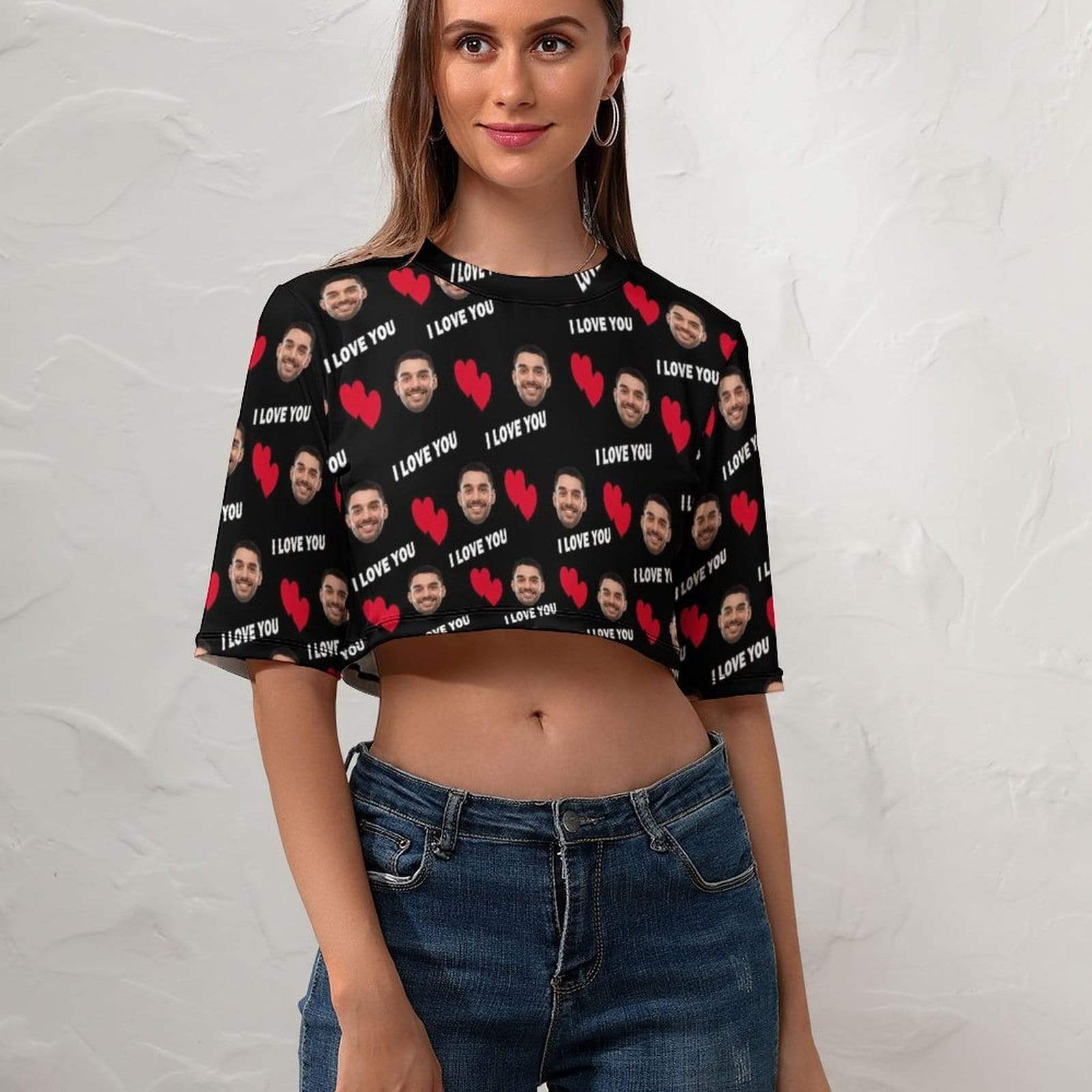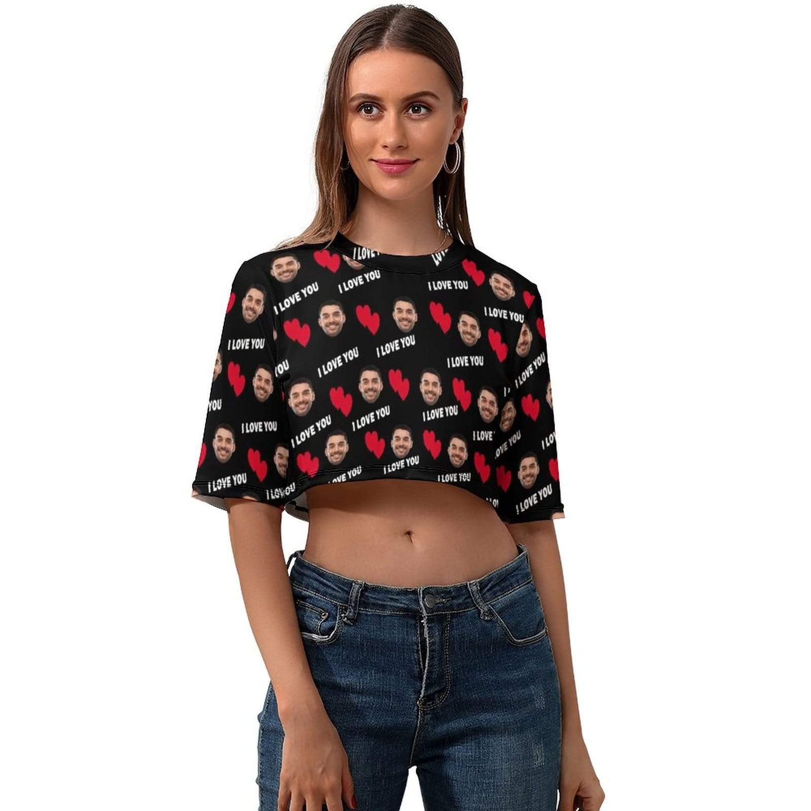 So whether you're looking to show off your own name or create a personalized gift for someone special, LateAndLow Store has got you covered. Start designing your own custom Custom Face Red Love Black Background Short Crop T-Shirt print-on-demand product today, and let us bring your vision to life!