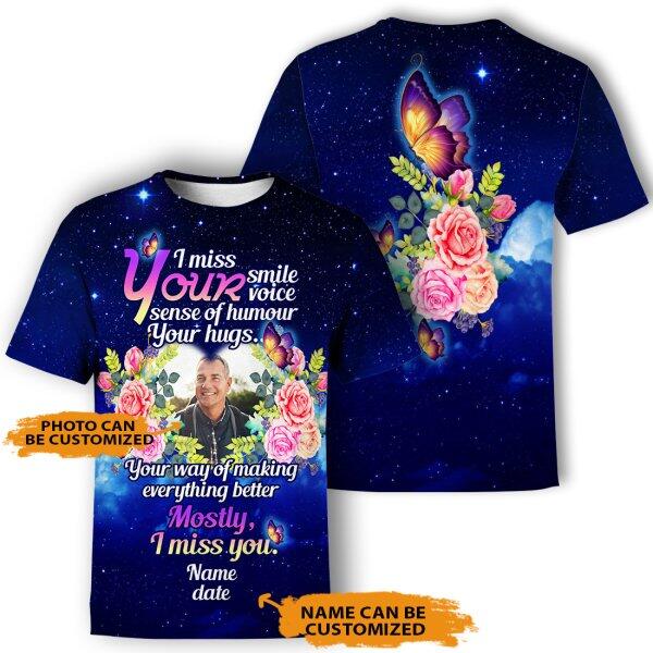 Custom Memorial All Over Print T-Shirt With Picture For Lost Loved Ones I Miss Your Smile Butterfly All Over Print T-Shirt Blue M239