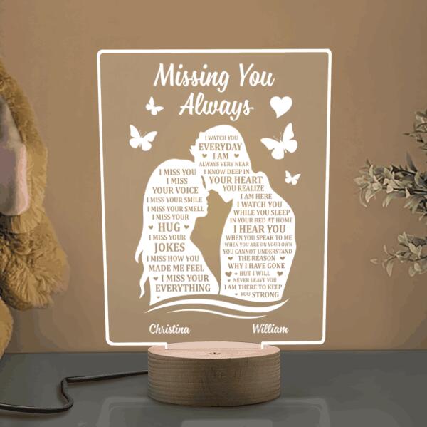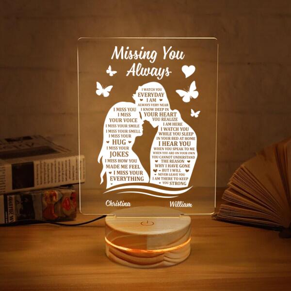 So whether you're looking to show off your own name or create a personalized gift for someone special, LateAndLow Store has got you covered. Start designing your own custom Customizable 3D Led Lamp Missing You Always Couple print-on-demand product today, and let us bring your vision to life!