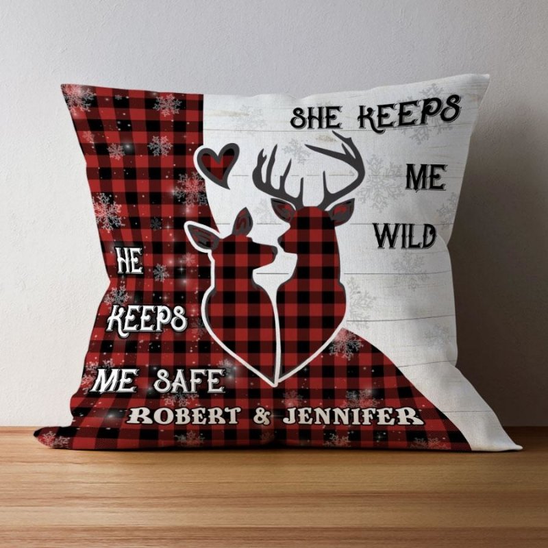 Deer Couple She Keeps Me Wild He Keeps Me Safe Personalized Christmas Pillow For Couple