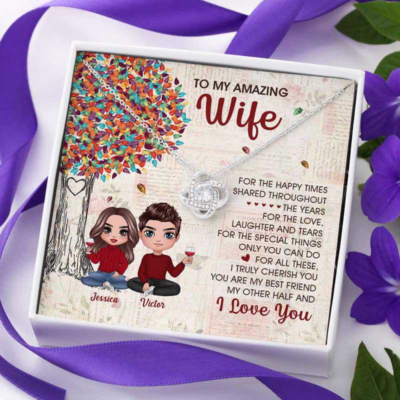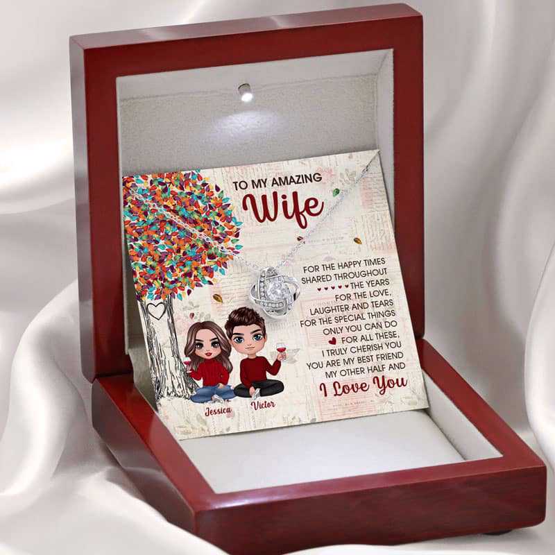 So whether you're looking to show off your own name or create a personalized gift for someone special, LateAndLow Store has got you covered. Start designing your own custom Doll Couple Sitting Vintage Personalized Love Knot Necklace Message Card print-on-demand product today, and let us bring your vision to life!