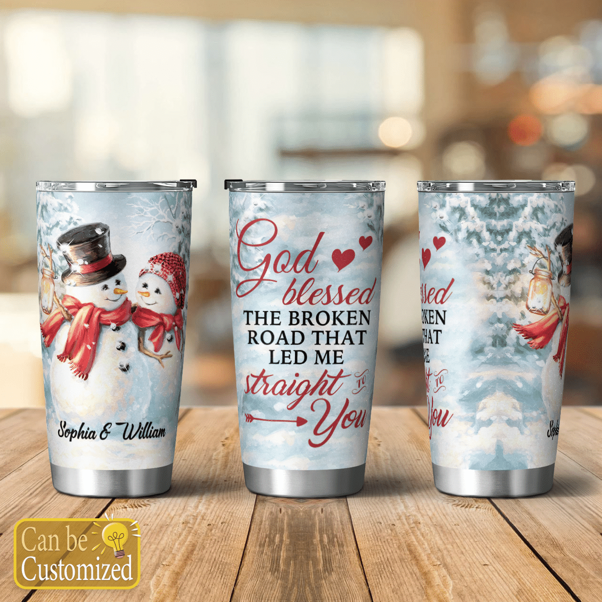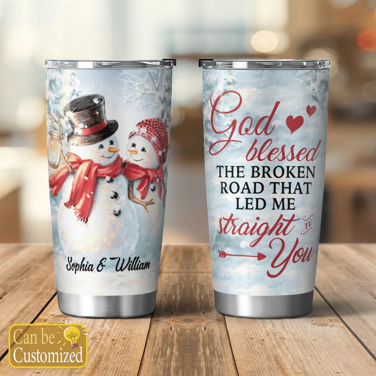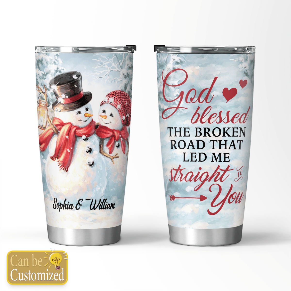 So whether you're looking to show off your own name or create a personalized gift for someone special, LateAndLow Store has got you covered. Start designing your own custom God Blessed The Broken Road Couple Snowman Tumbler print-on-demand product today, and let us bring your vision to life!