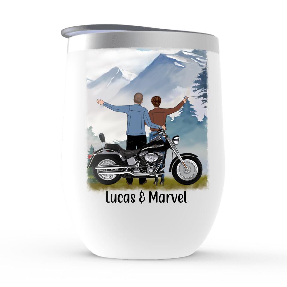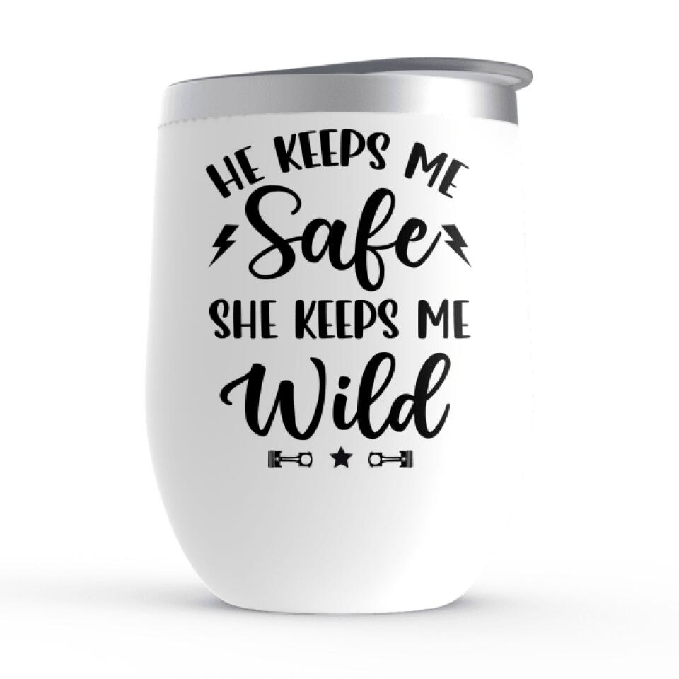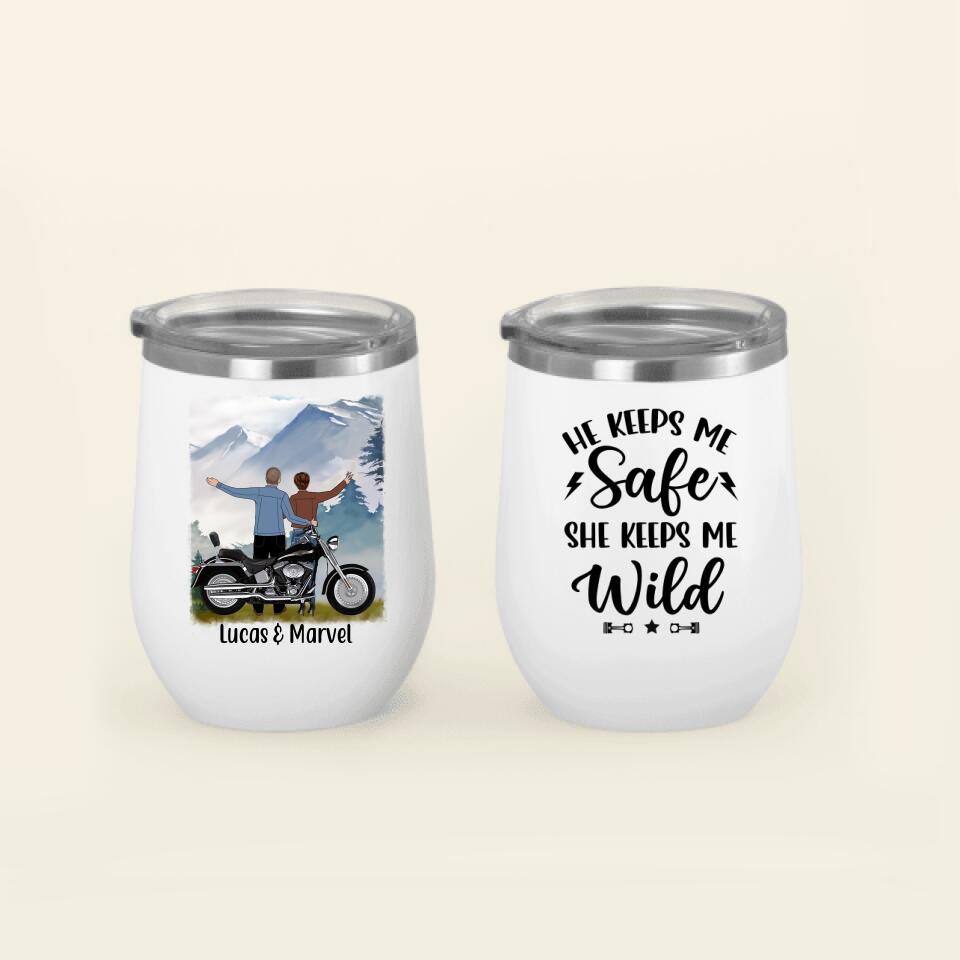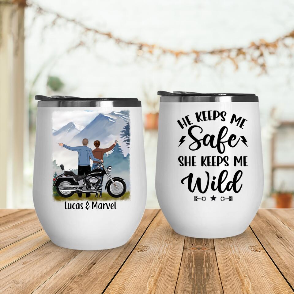 He Keeps Me Safe She Keeps Me Wild – Personalized Wine Tumbler For Couples, Motorcycle Lovers
