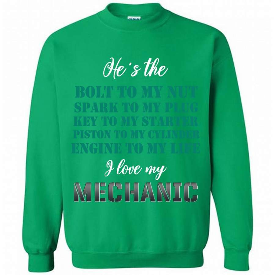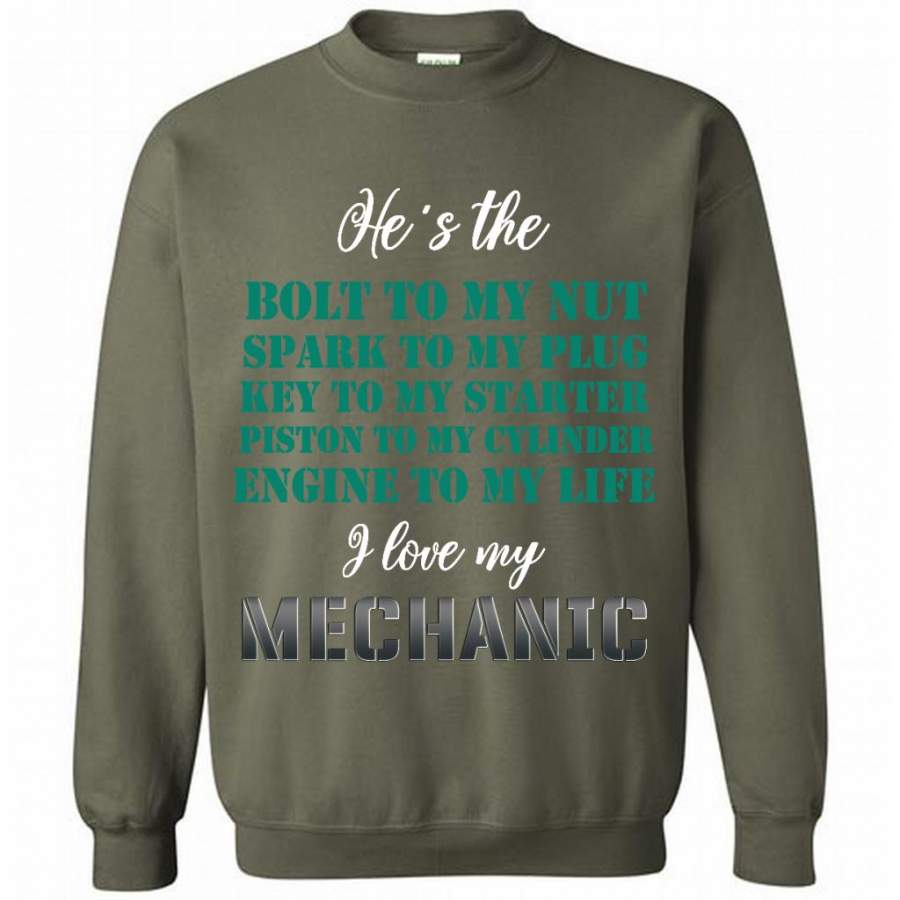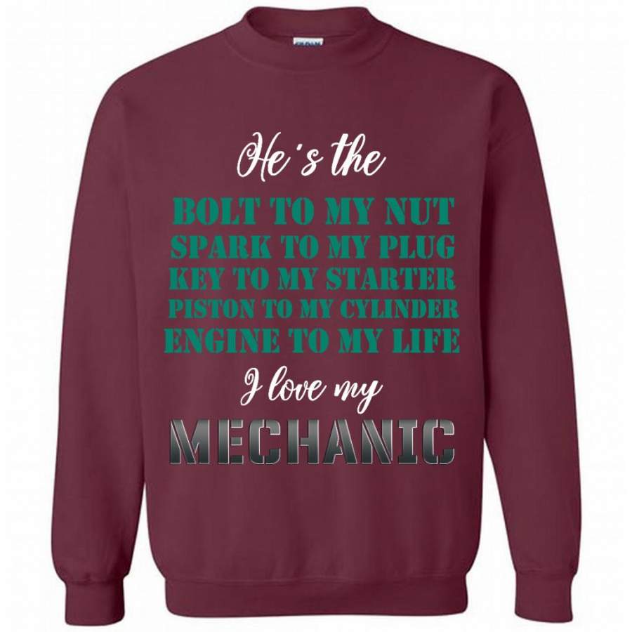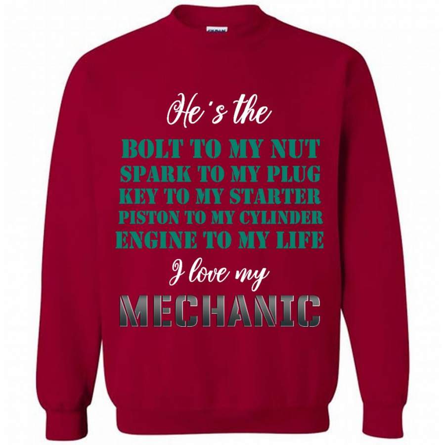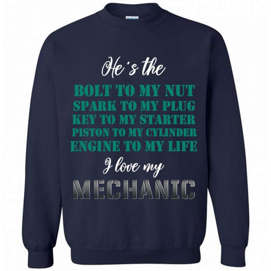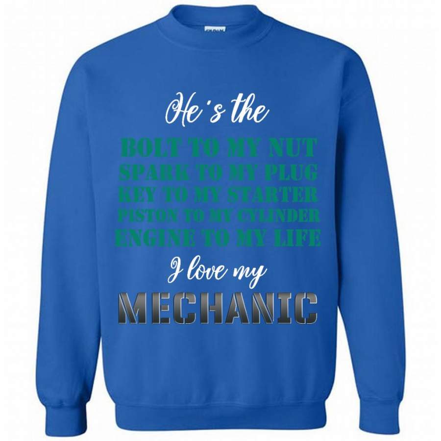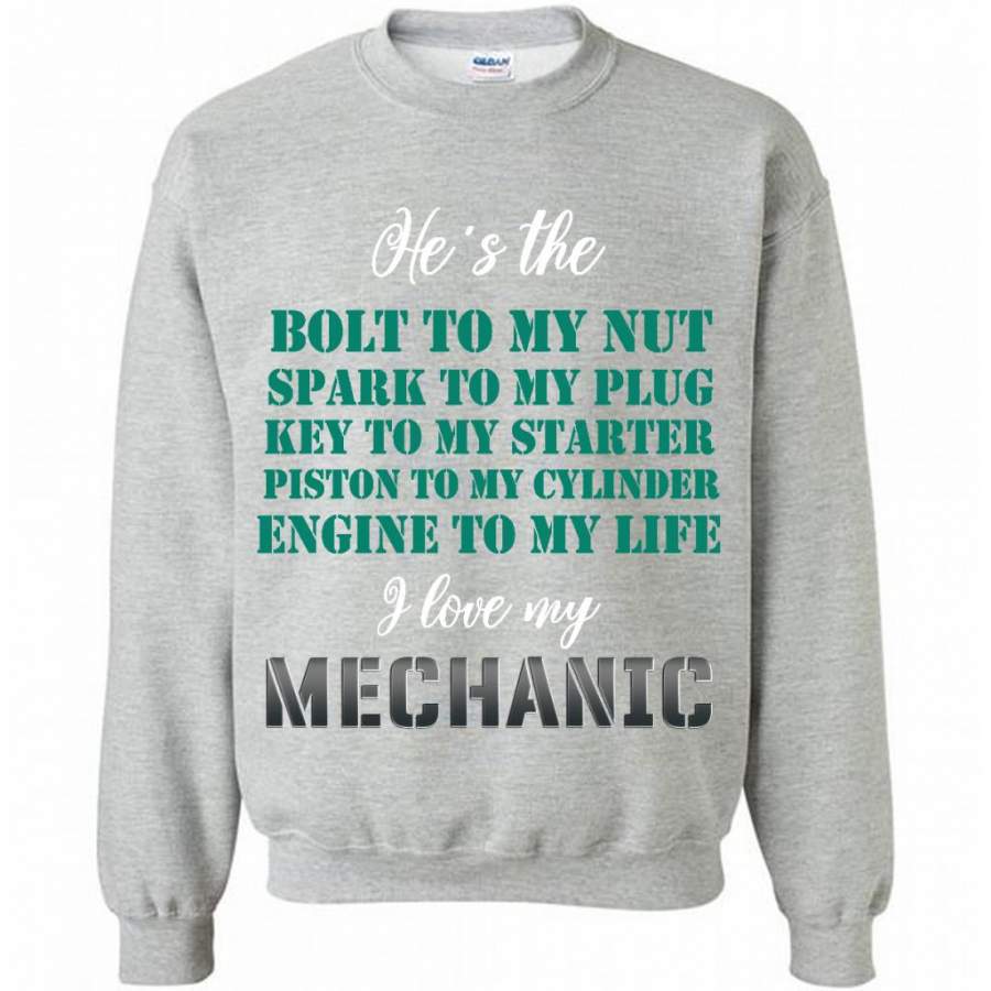 He’s The Bolt to My Nut Spark To My Plug Key To My Starter Piston To My Cylinder Engine to My Life I Love My Mechanic – Gildan Crewneck Sweatshirt