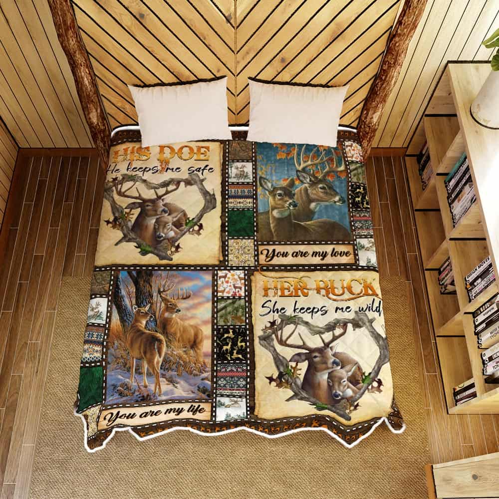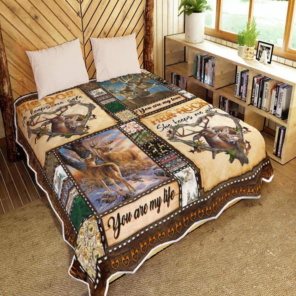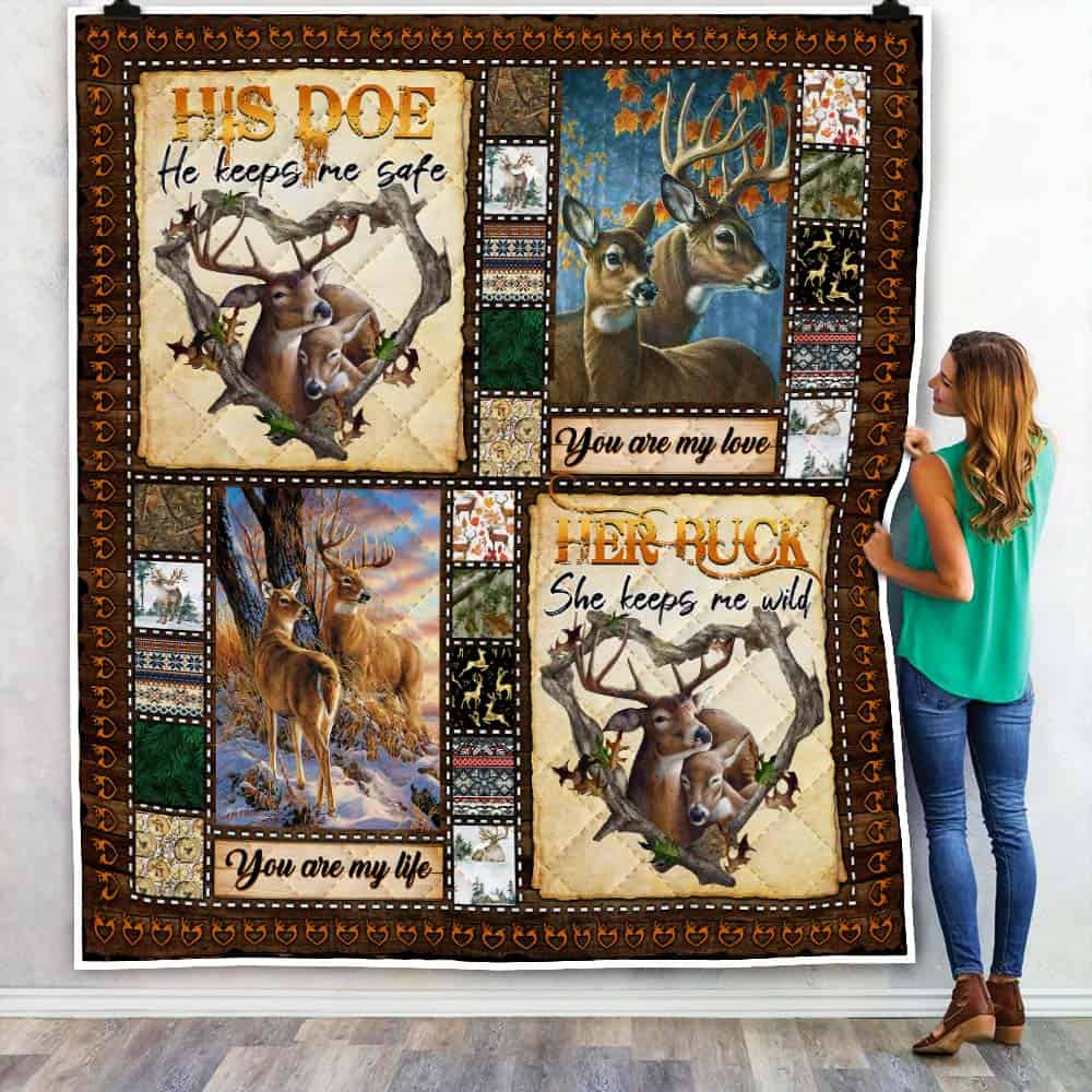 The His Doe & Her Buck. Husband And Wife Deer Couple Quilt Blanket is unique design using high quality thread; all stitches are even, tight and dense which makes it durable.