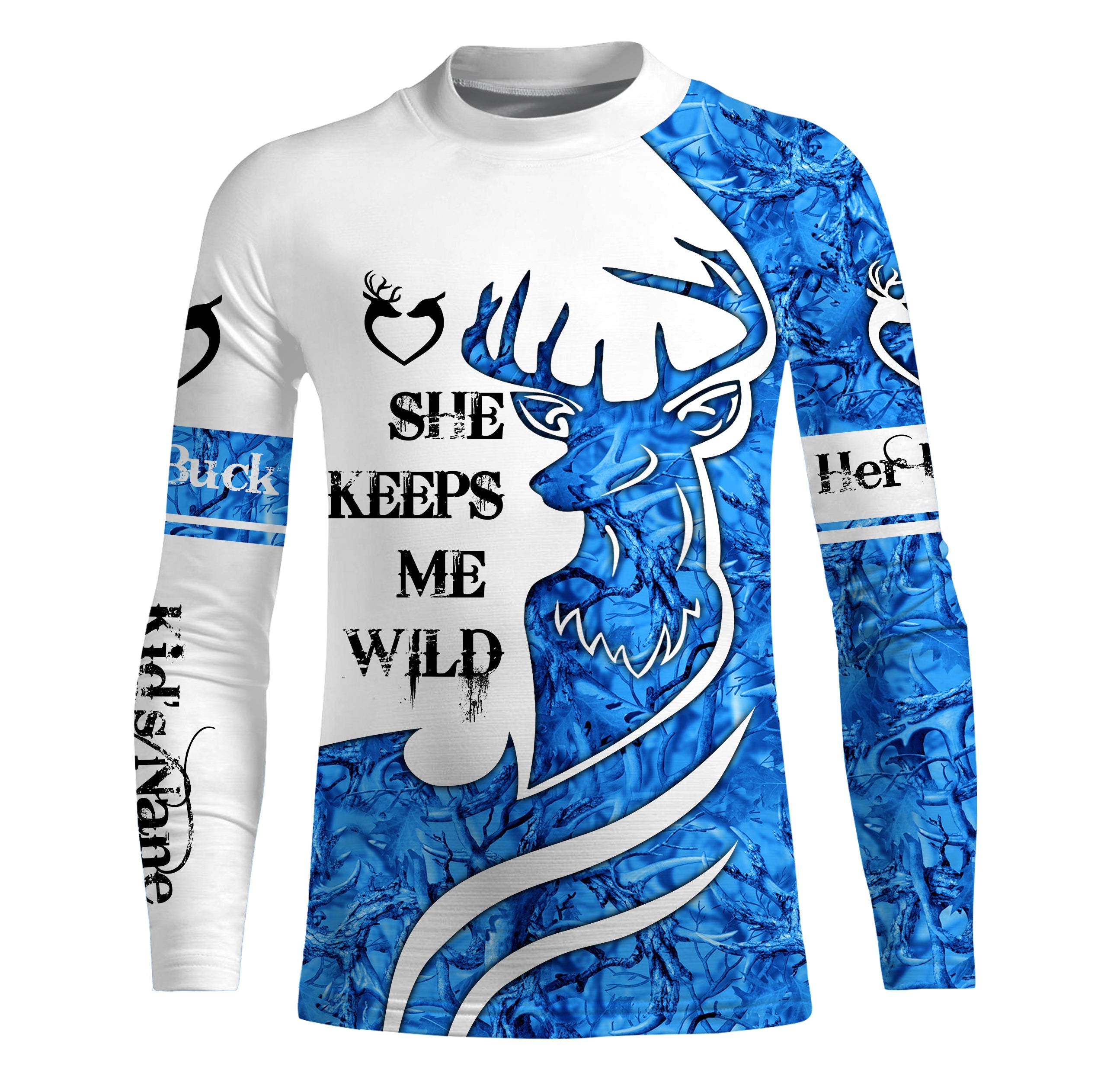 So whether you're looking to show off your own name or create a personalized gift for someone special, LateAndLow Store has got you covered. Start designing your own custom His Doe Her Buck She Keeps Me Wild Blue Camo Men Version Customize Matching Couples 3D All Over Printed Shirts, Valentine Shirts Nqs2782 print-on-demand product today, and let us bring your vision to life!