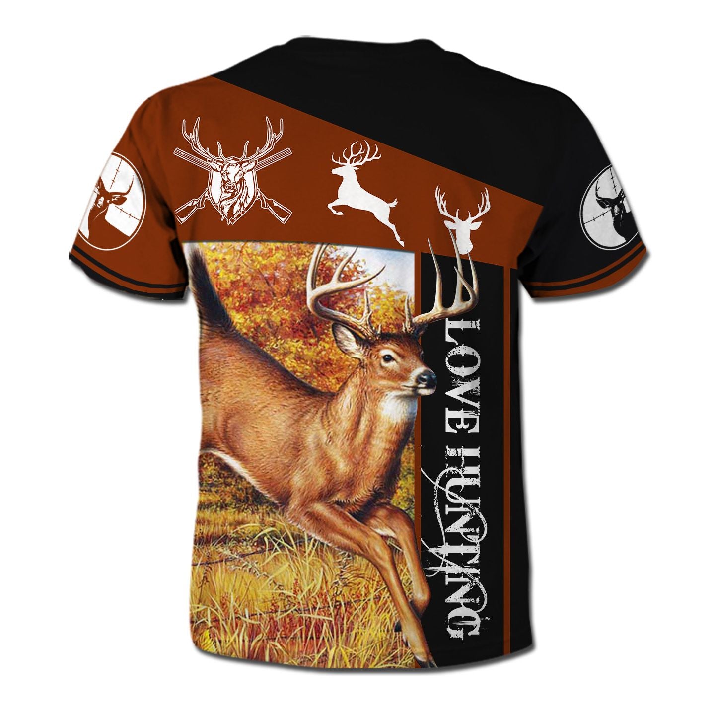 So whether you're looking to show off your own name or create a personalized gift for someone special, LateAndLow Store has got you covered. Start designing your own custom Hunting T-Shirt Love Hunting Deer Hunting Silhouette 3D Brown Shirt Full Size Full Print print-on-demand product today, and let us bring your vision to life!