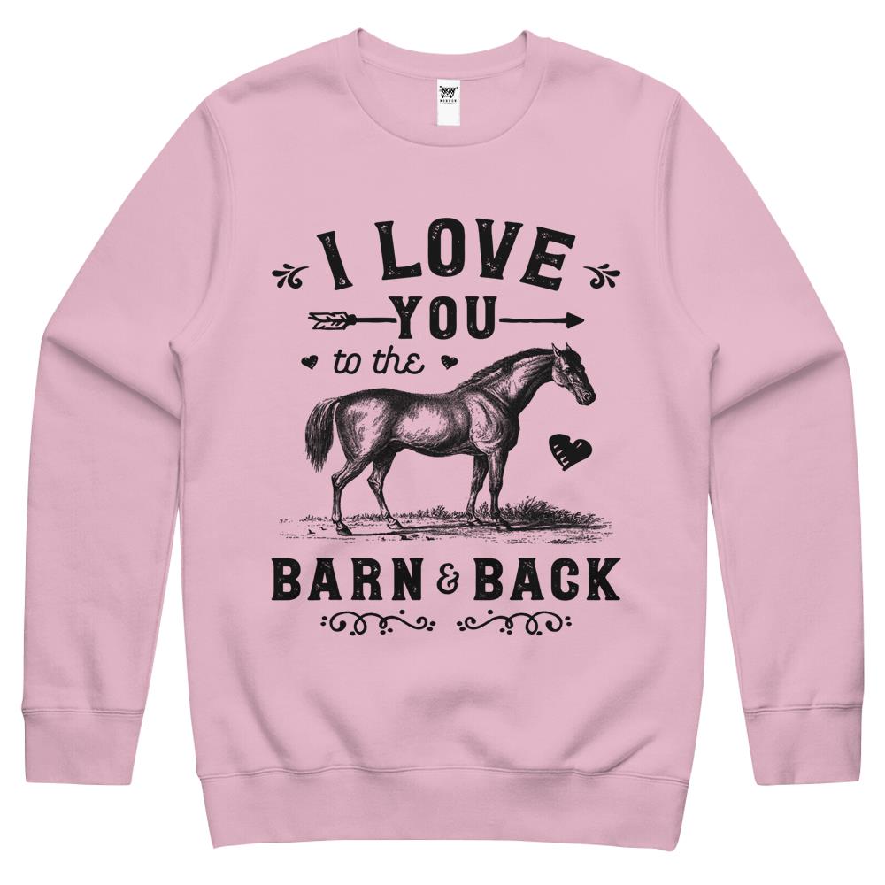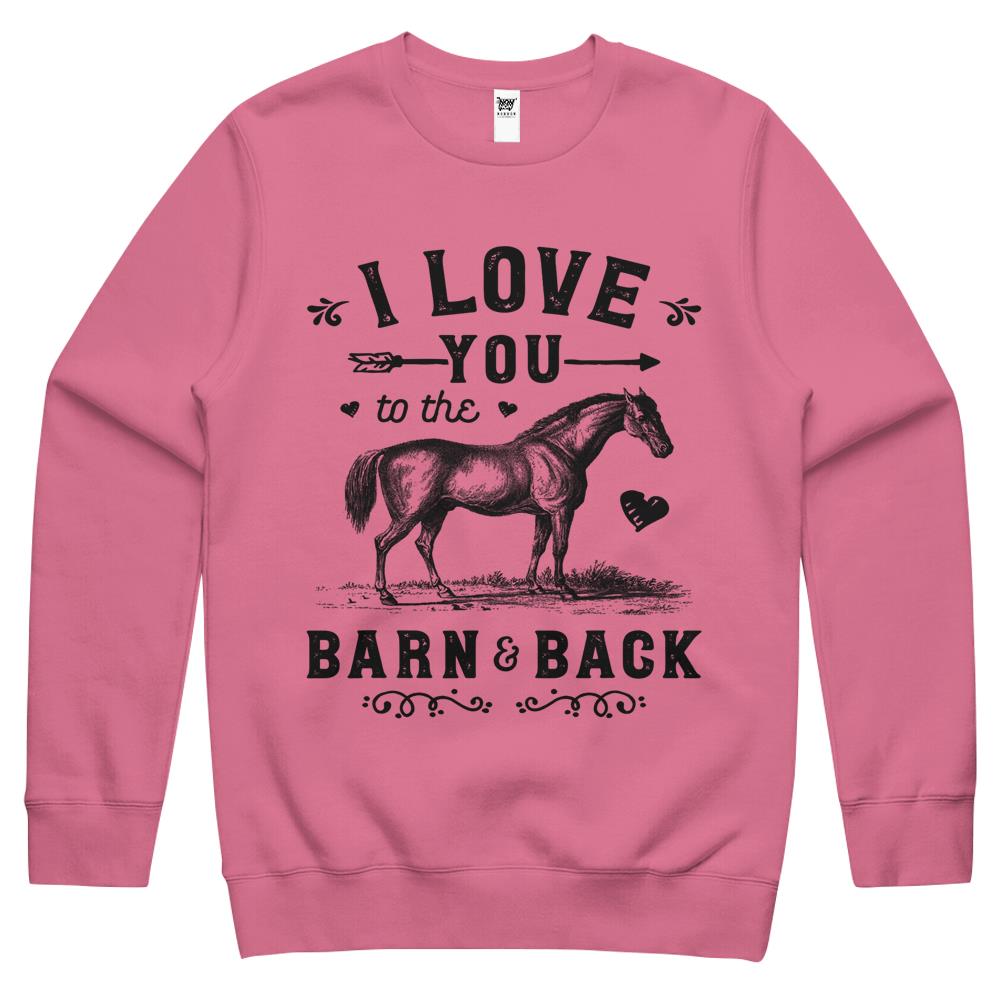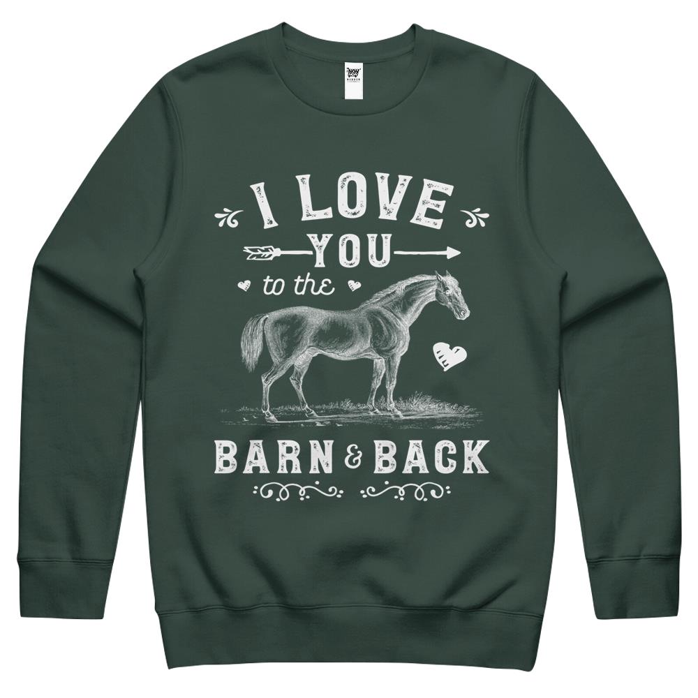 So whether you're looking to show off your own name or create a personalized gift for someone special, LateAndLow Store has got you covered. Start designing your own custom I Love You To The Barn And Back Horse Girl Horseback Riding Crewneck Sweatshirt print-on-demand product today, and let us bring your vision to life!