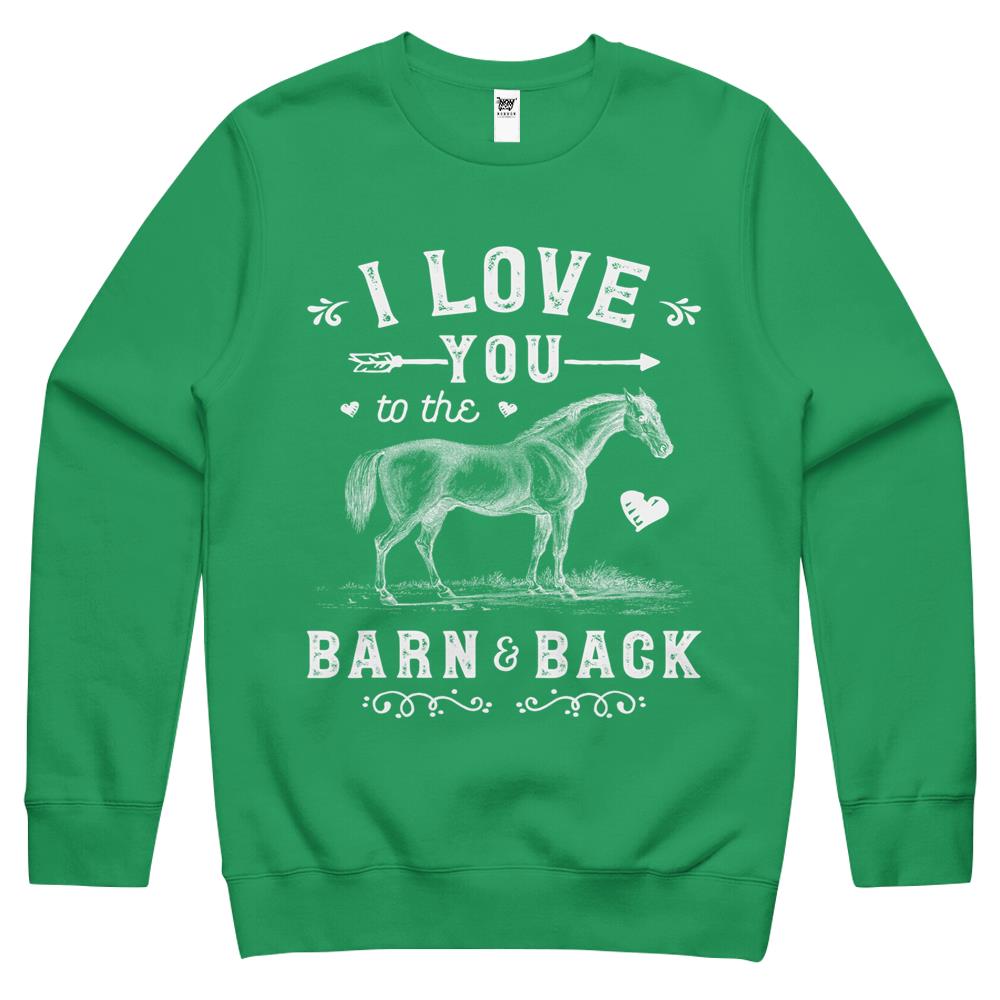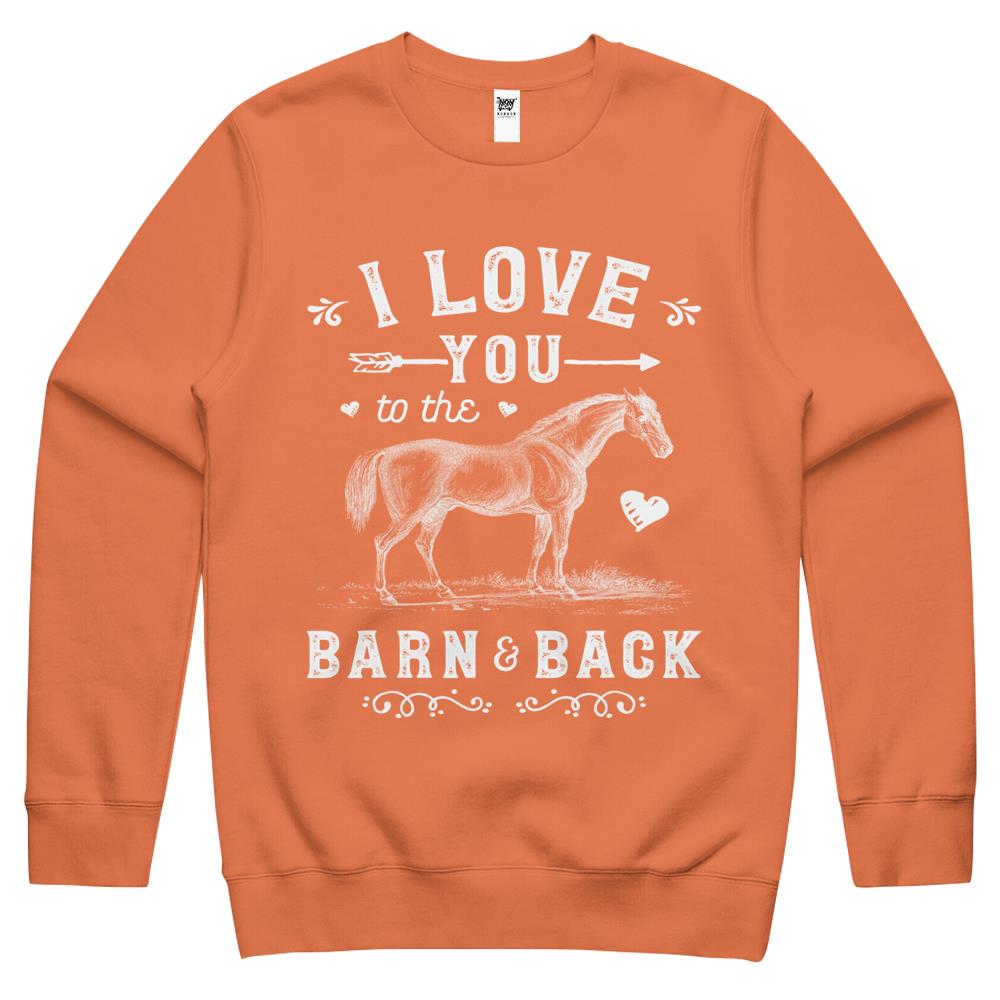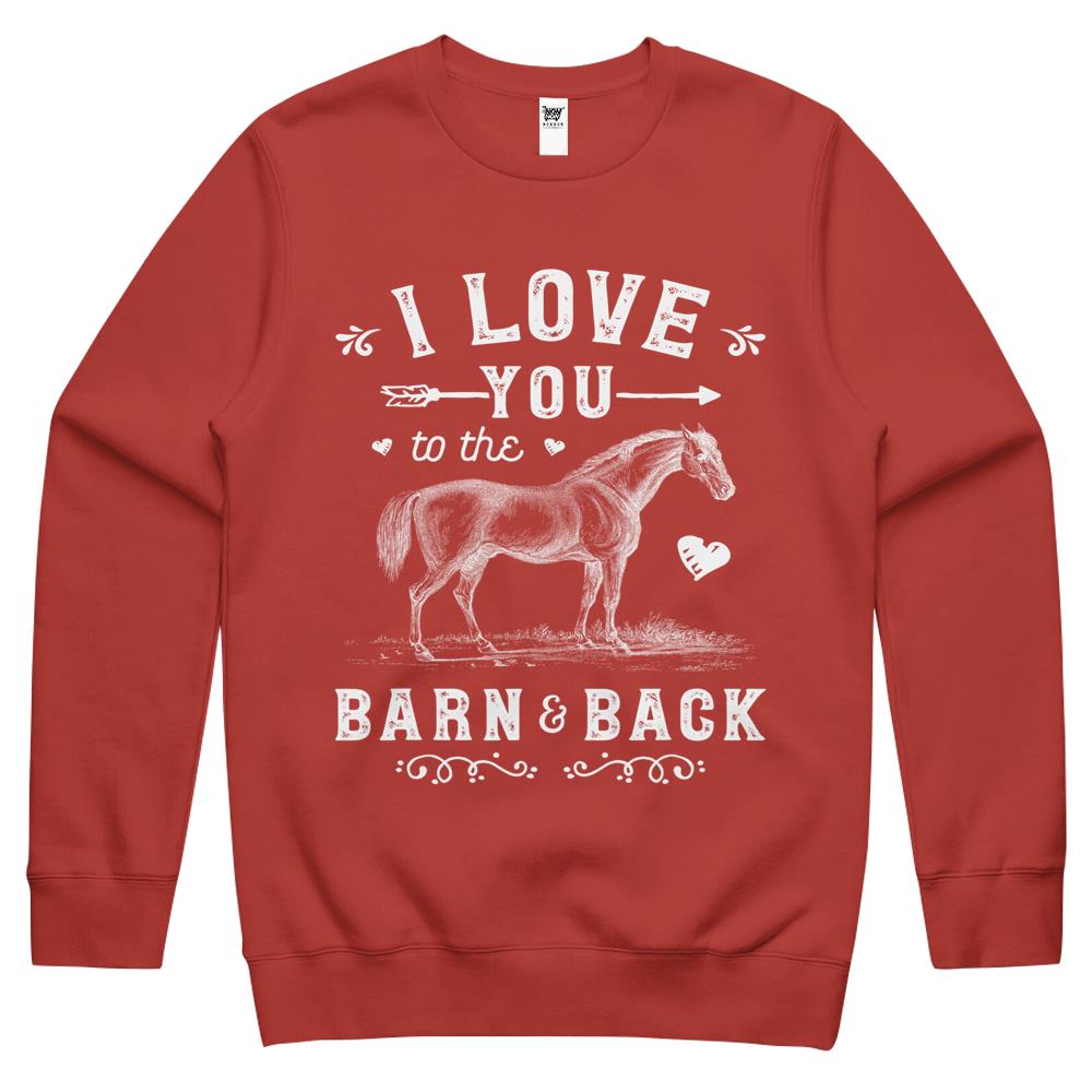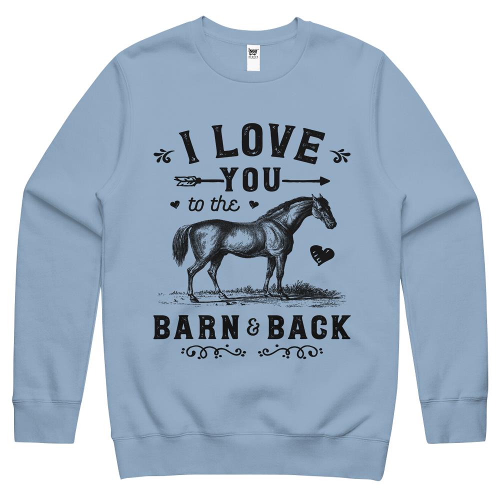 So whether you're looking to show off your own name or create a personalized gift for someone special, LateAndLow Store has got you covered. Start designing your own custom I Love You To The Barn And Back Horse Girl Horseback Riding Crewneck Sweatshirt print-on-demand product today, and let us bring your vision to life!