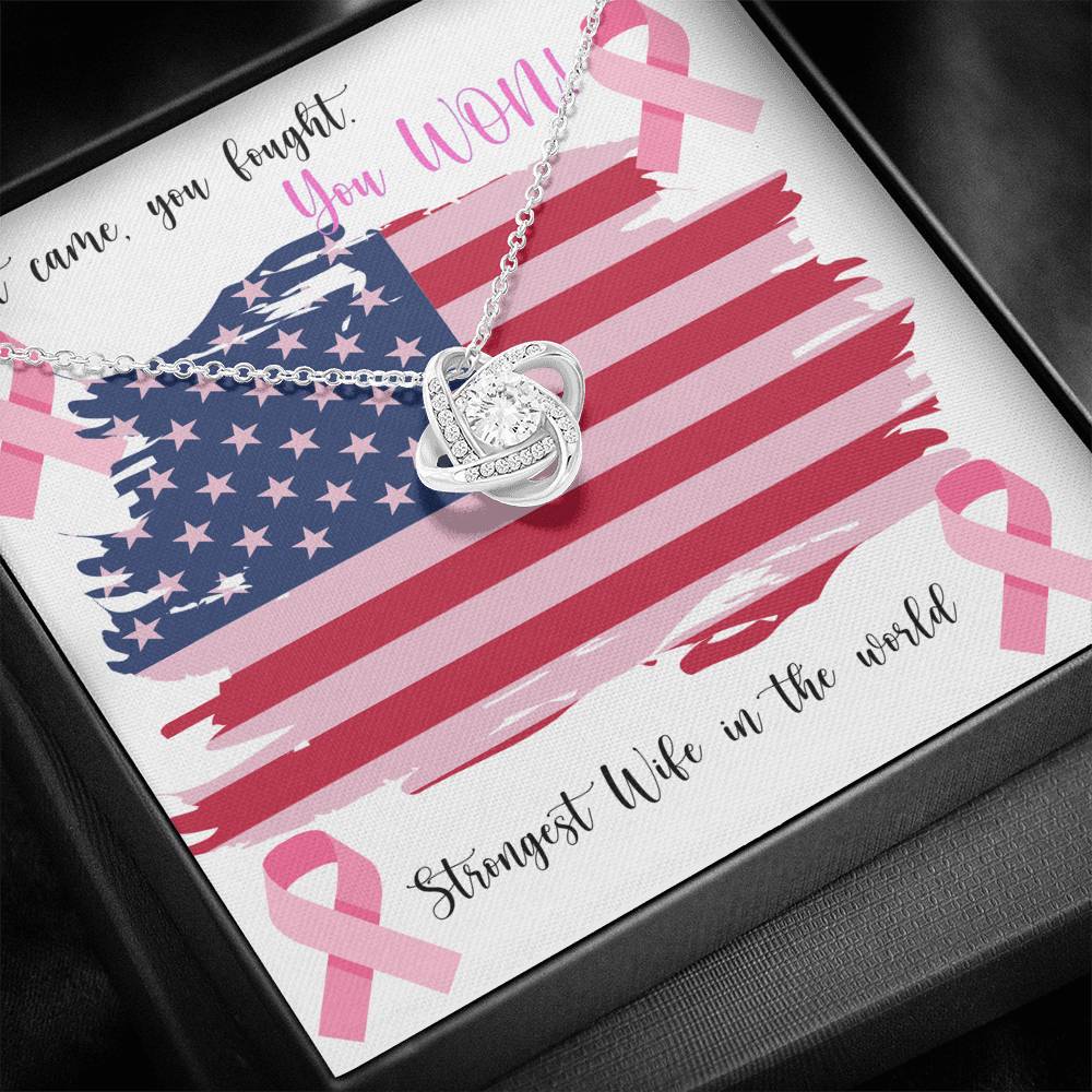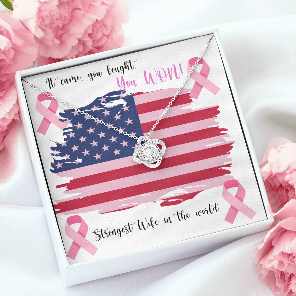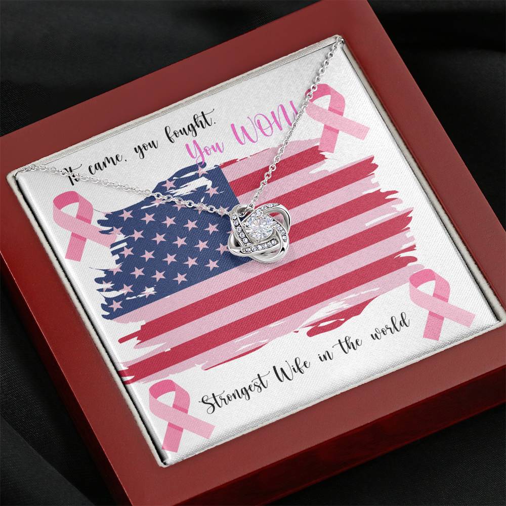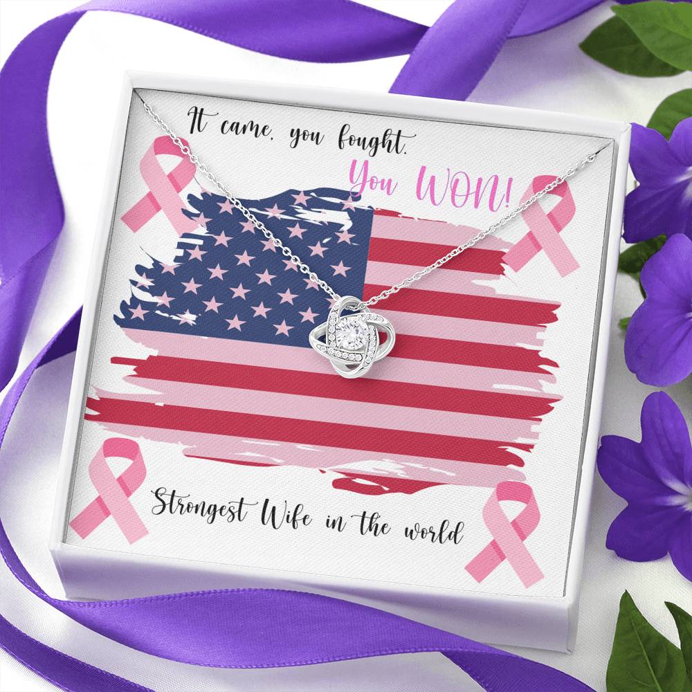 Our print-on-demand products are made with the highest quality materials, ensuring that your personalized It Came, You Fought, You Won | Strongest Wife In The World Love Knot Necklace design looks great and feels comfortable. You can wear your new custom product with pride or give it as a unique and memorable gift that will be cherished for years to come.