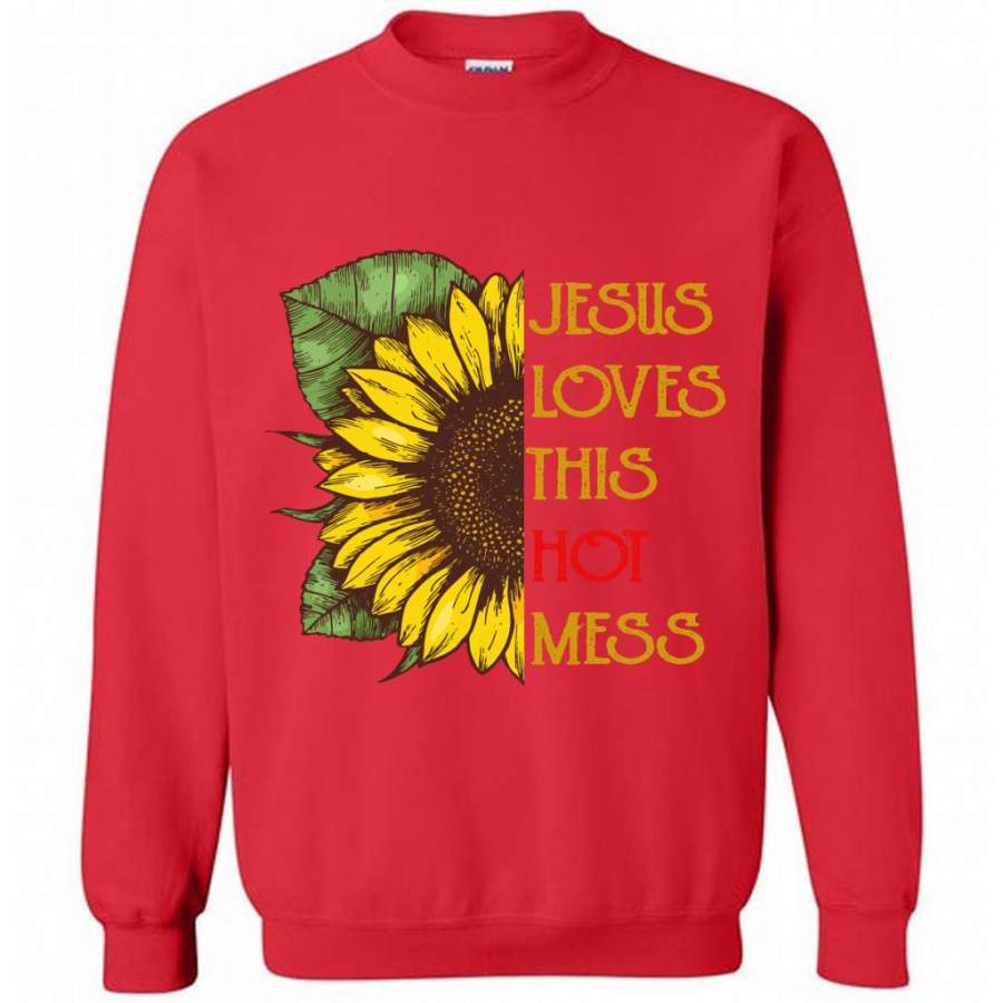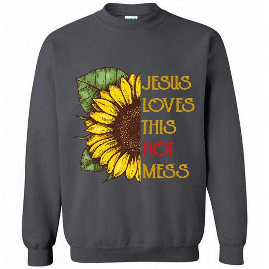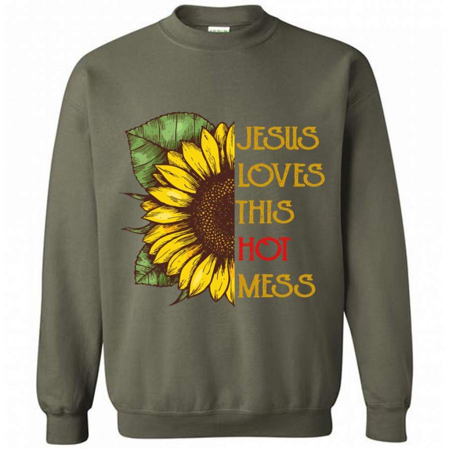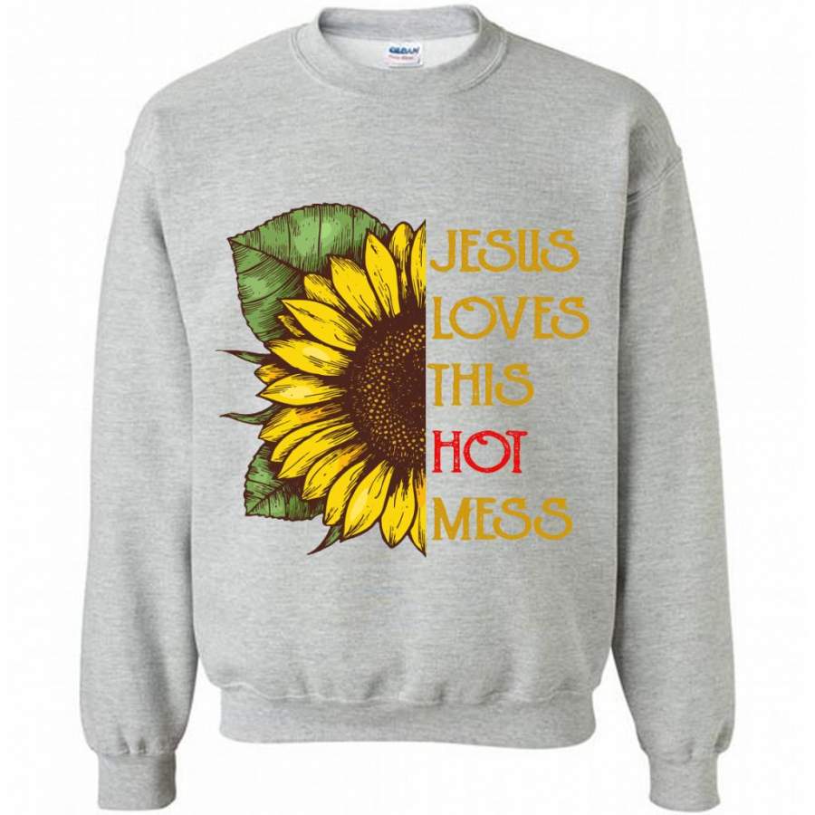 Jesus Loves This Hot Mess, Christian Lover, Sunflower Design – Gildan Crewneck Sweatshirt