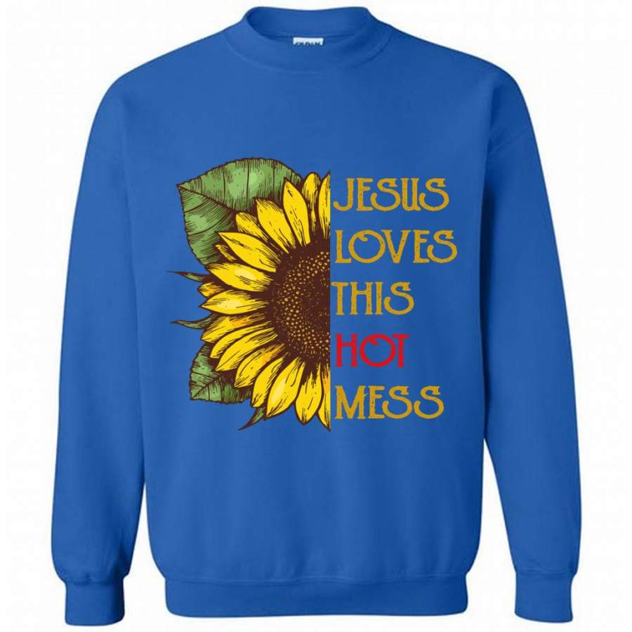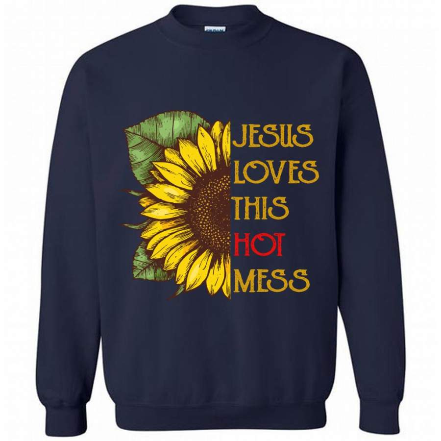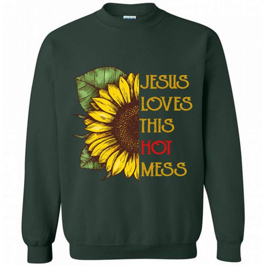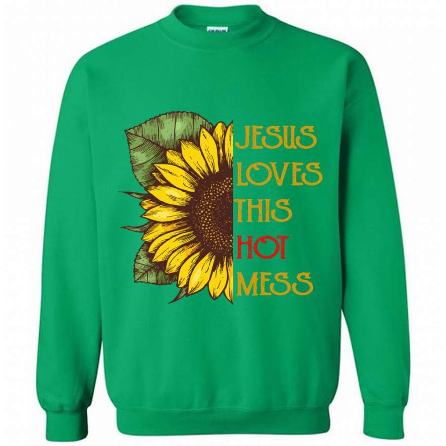 Jesus Loves This Hot Mess, Christian Lover, Sunflower Design – Gildan Crewneck Sweatshirt