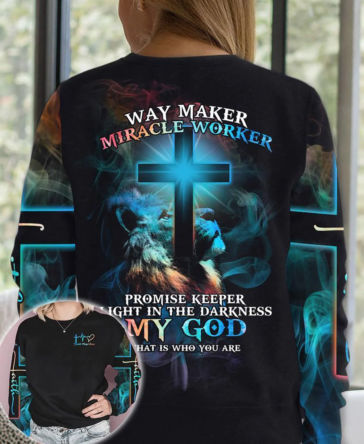 So whether you're looking to show off your own name or create a personalized gift for someone special, LateAndLow Store has got you covered. Start designing your own custom Lion Cross Light Way Maker Miracle Worker Faith Hope Love 3D All Over Print print-on-demand product today, and let us bring your vision to life!