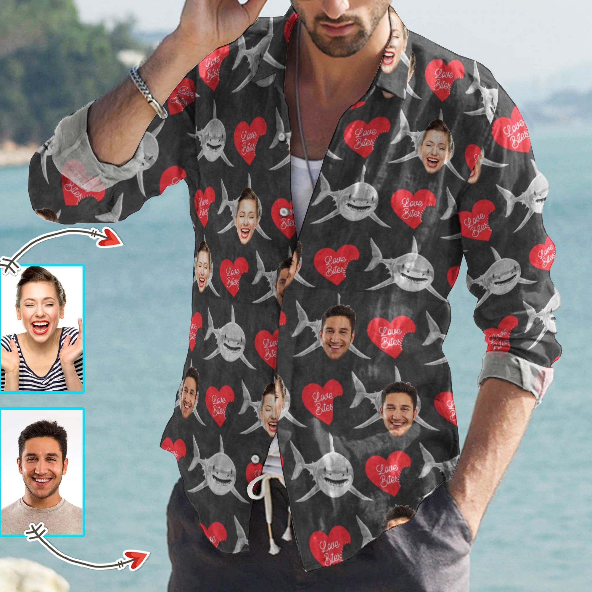 So whether you're looking to show off your own name or create a personalized gift for someone special, LateAndLow Store has got you covered. Start designing your own custom Love Bites Of Sharks Cotton And Linen Casual Shirt QABM231211 print-on-demand product today, and let us bring your vision to life!