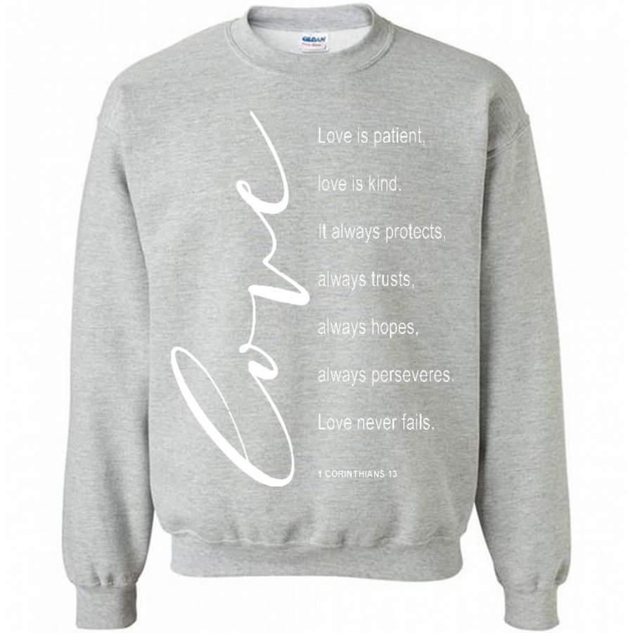 So whether you're looking to show off your own name or create a personalized gift for someone special, LateAndLow Store has got you covered. Start designing your own custom Love Is Patient Love Is Kind It Always Protects Always Trusts Always Hopes Always Perseveres Love Never Fails – Gildan Crewneck Sweatshirt print-on-demand product today, and let us bring your vision to life!