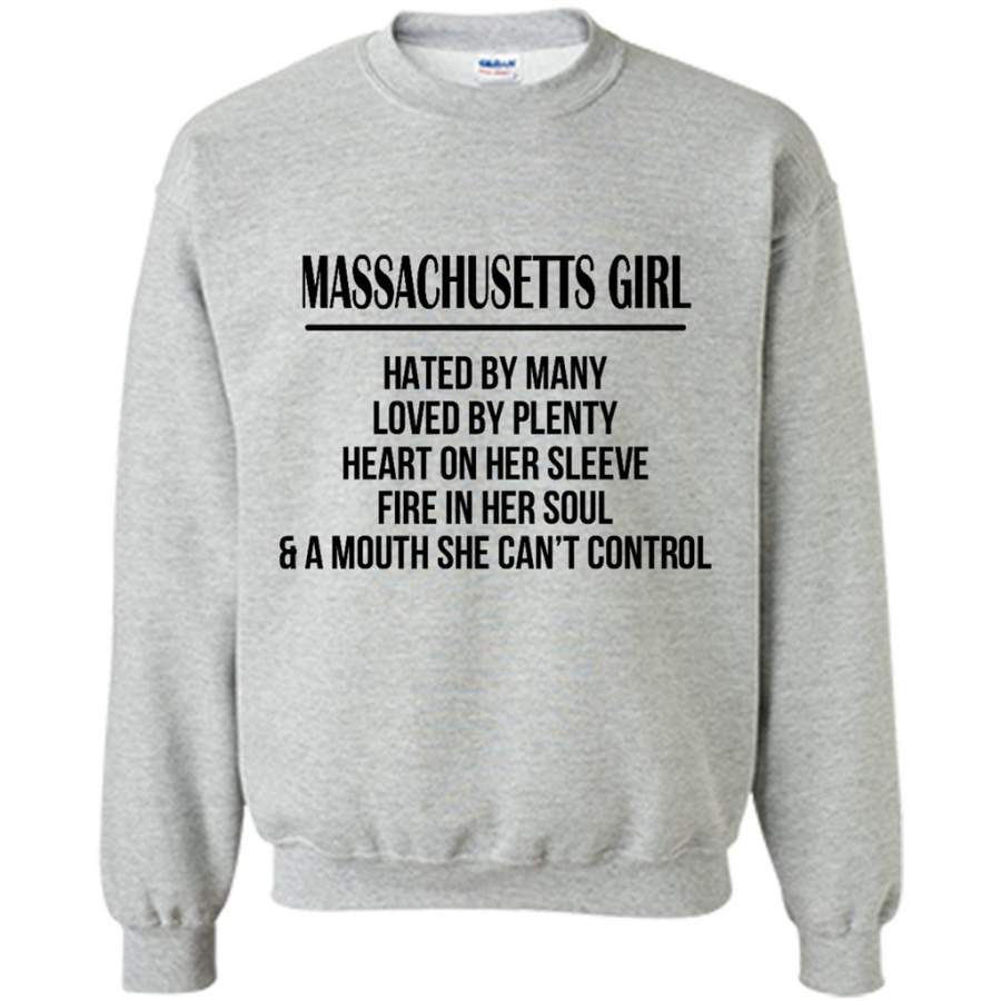 Massachusetts Girl Hated By Many Loved By Plenty Heart On Her Sleeve Fire In Her Soul A Mouth She Can’t Control – Gildan Crewneck Sweatshirt