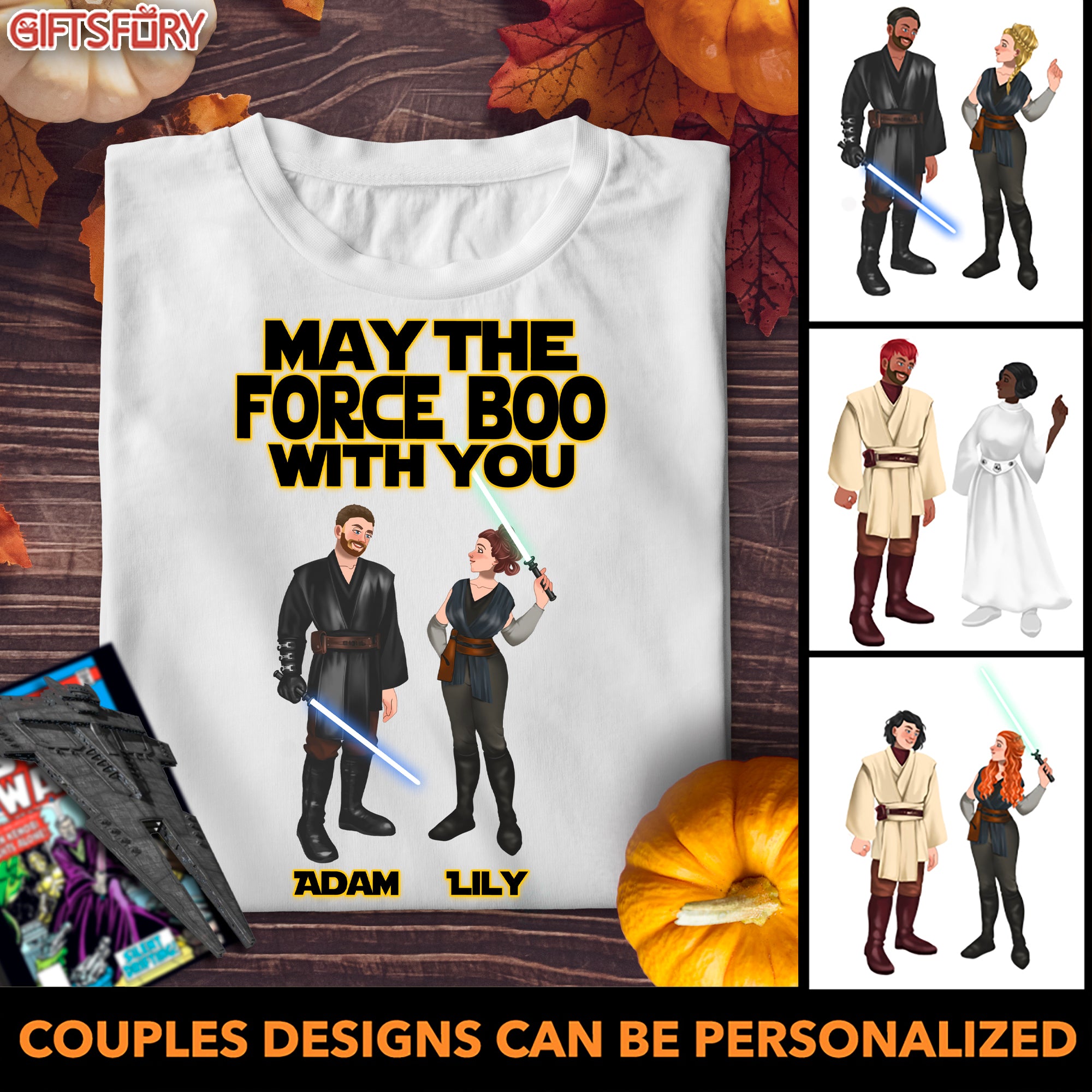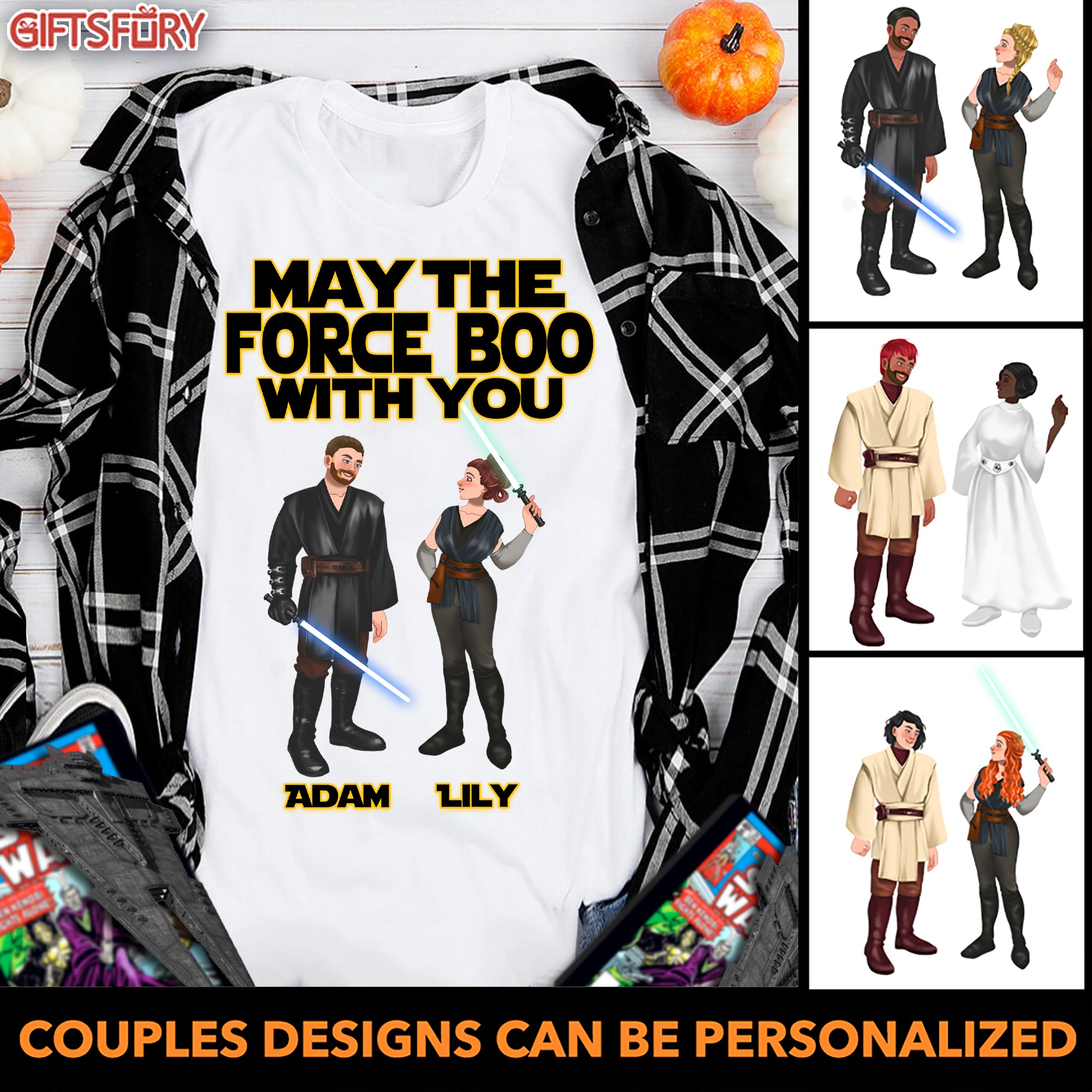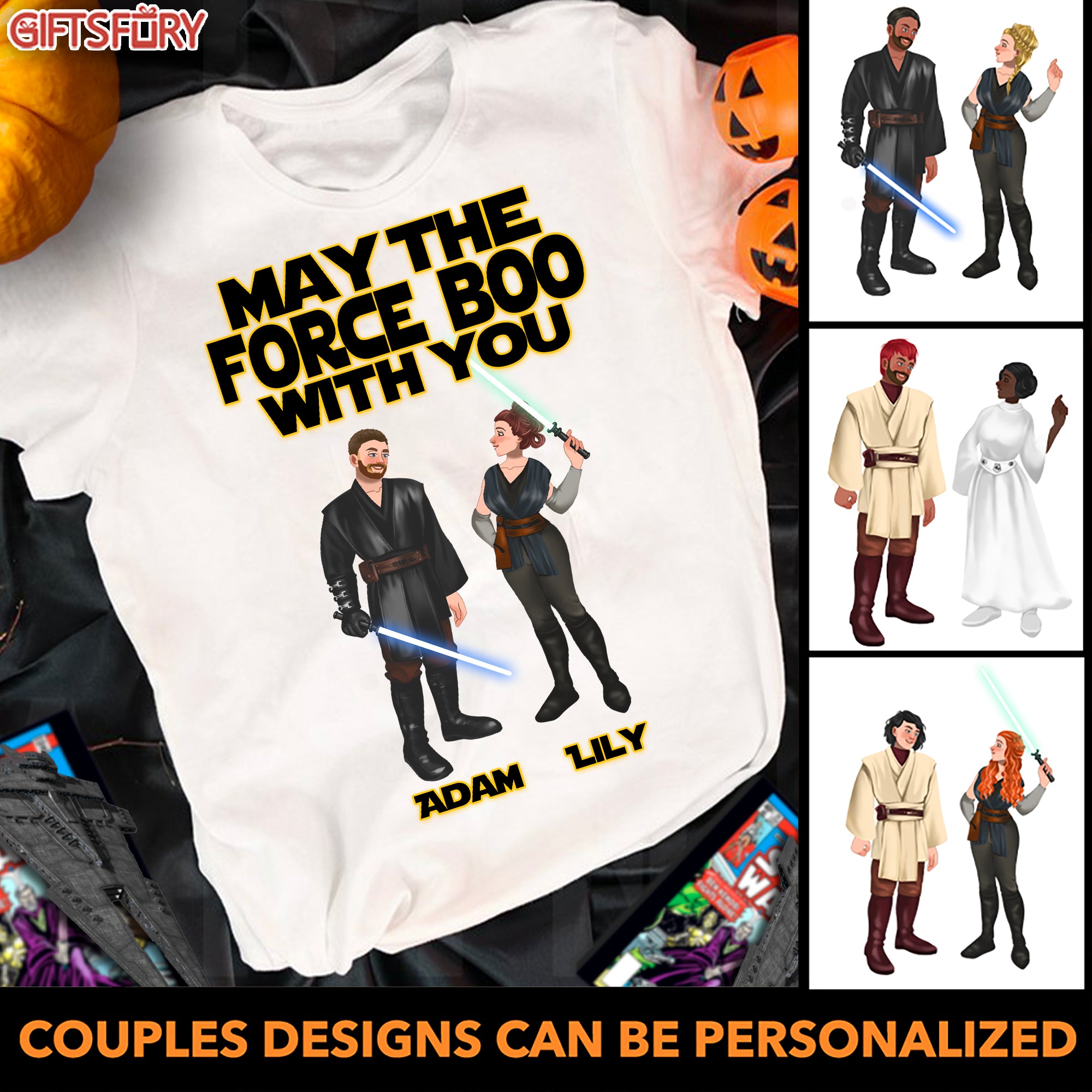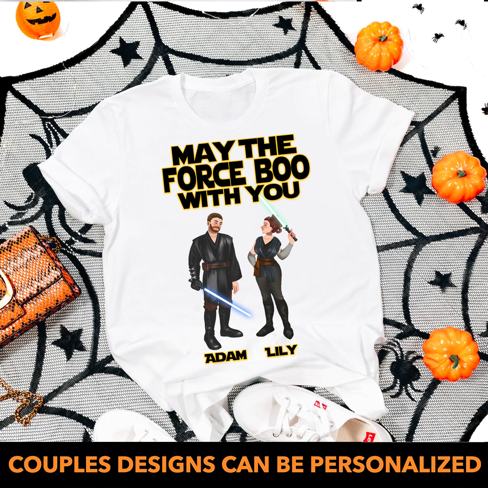 So whether you're looking to show off your own name or create a personalized gift for someone special, LateAndLow Store has got you covered. Start designing your own custom May The Force Boo With You – Star W Couple – Personalized Tshirt print-on-demand product today, and let us bring your vision to life!
