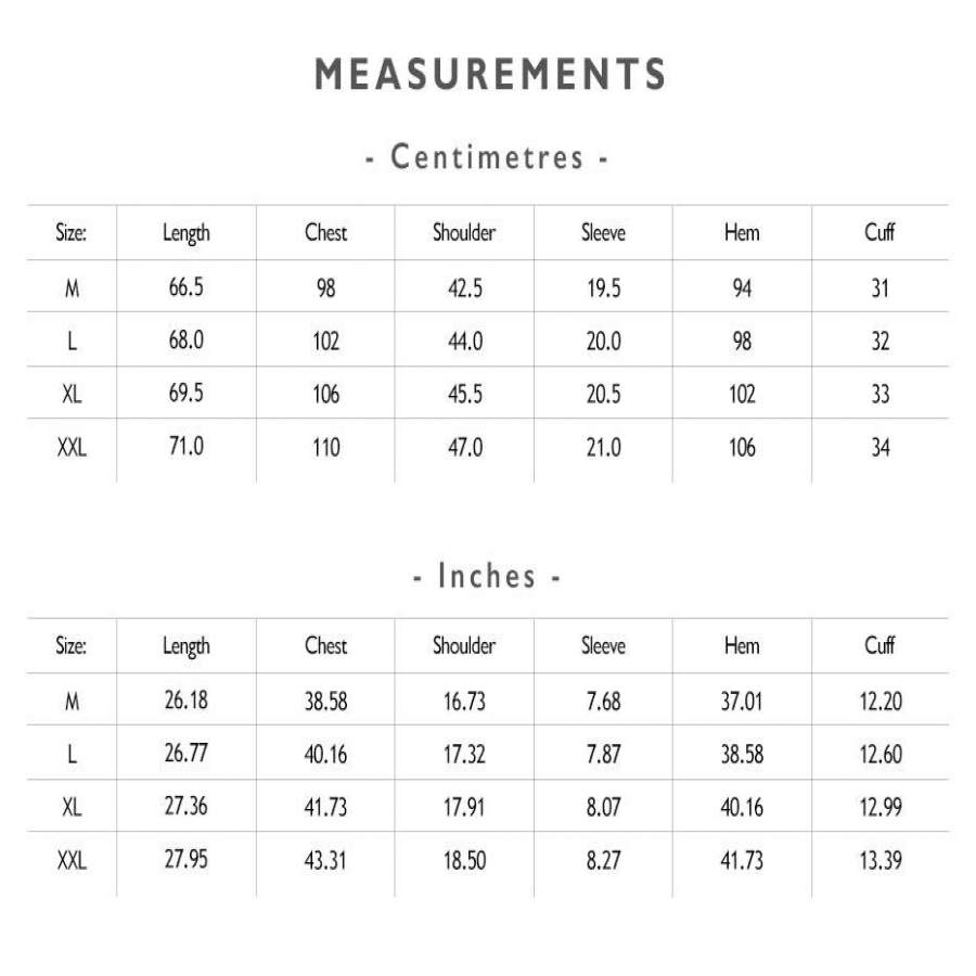 | Shoulder (cm / inch) | 58 / 22.8" | 61 / 24.0" | 63 / 24.8" | 65 / 25.6" | 67 / 26.4" |