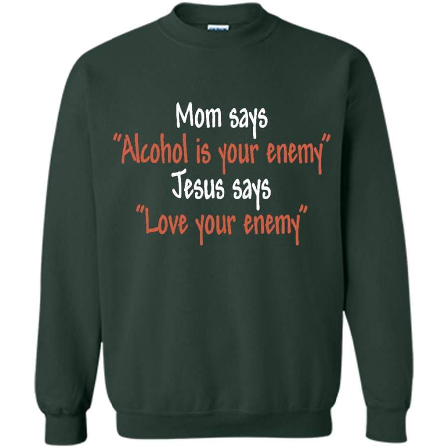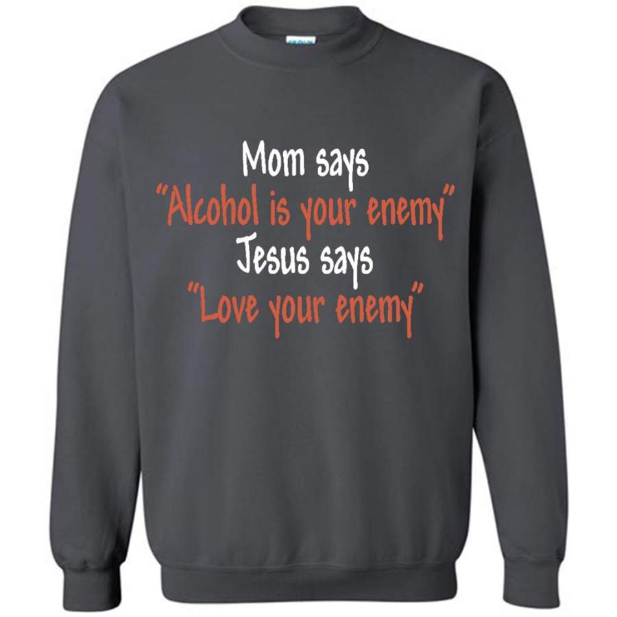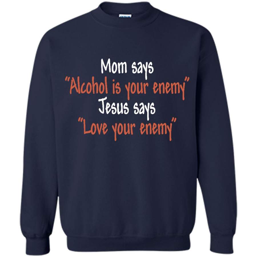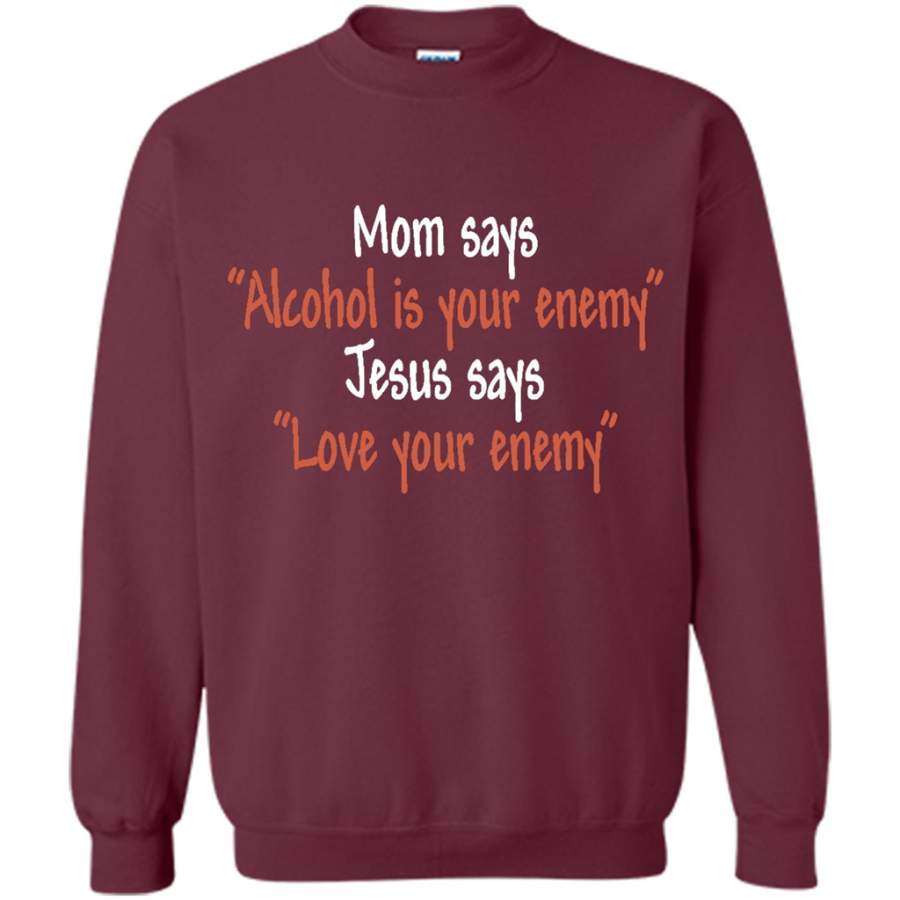 Mom Says Alcohol Is Your Enemy, Jesus says Love Your Enemy – Gildan Crewneck Sweatshirt