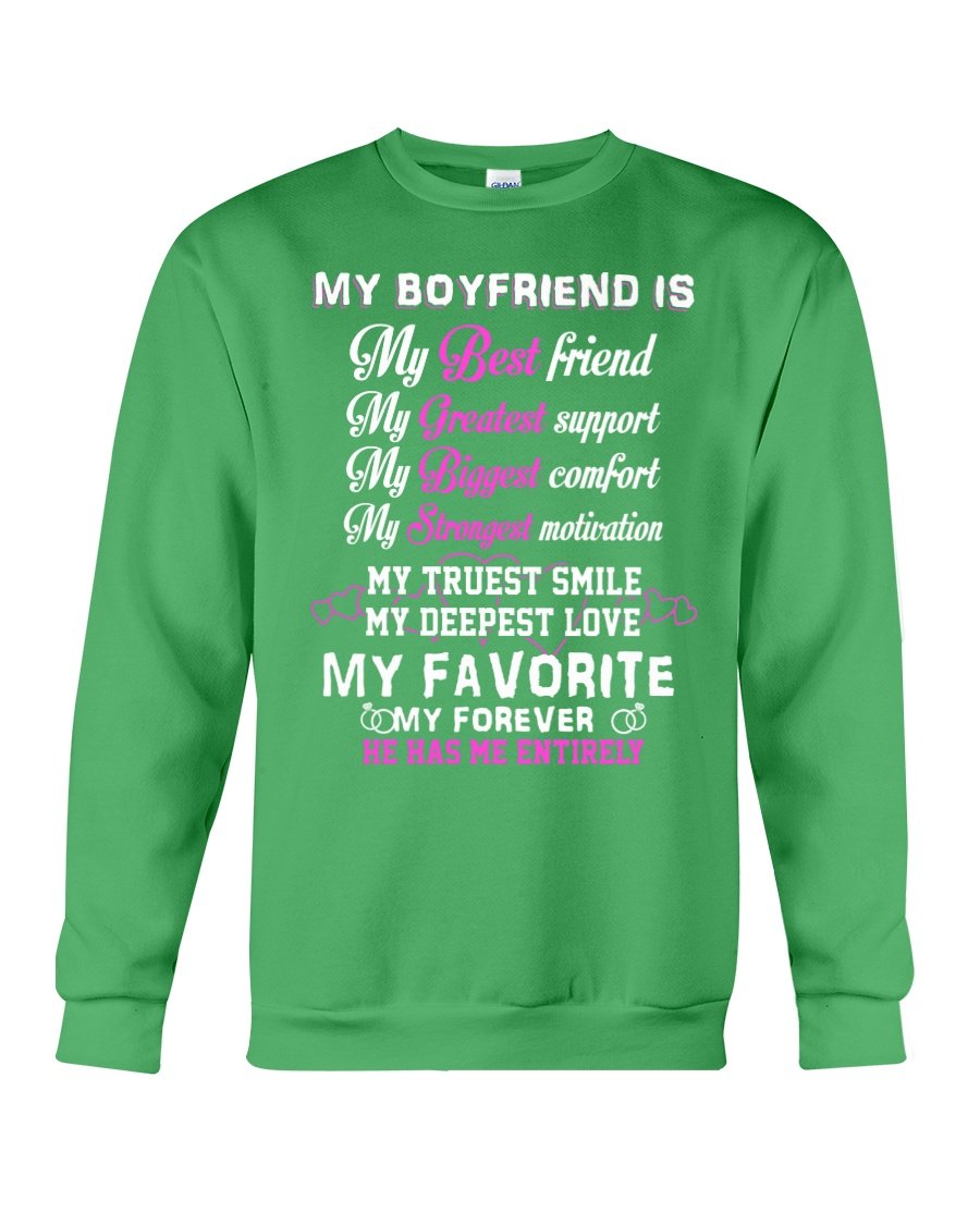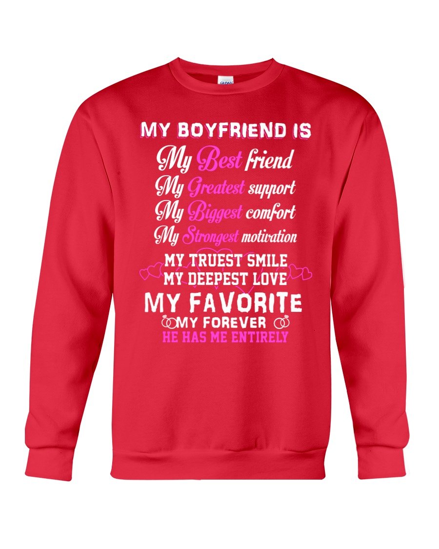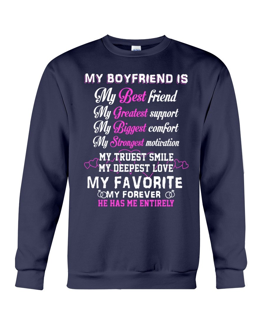 So whether you're looking to show off your own name or create a personalized gift for someone special, LateAndLow Store has got you covered. Start designing your own custom My Boyfriend My Deepest Love My Forever He Has Me Entirely Sweatshirt print-on-demand product today, and let us bring your vision to life!