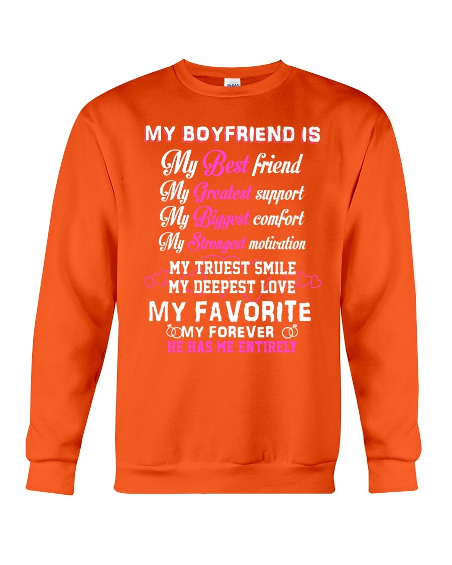 Our print-on-demand products are made with the highest quality materials, ensuring that your personalized My Boyfriend My Deepest Love My Forever He Has Me Entirely Sweatshirt design looks great and feels comfortable. You can wear your new custom product with pride or give it as a unique and memorable gift that will be cherished for years to come.