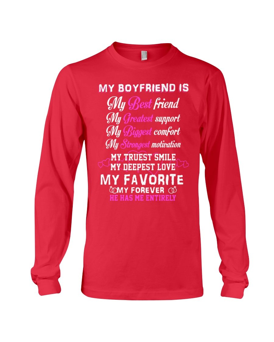 So whether you're looking to show off your own name or create a personalized gift for someone special, LateAndLow Store has got you covered. Start designing your own custom My Boyfriend My Deepest Love My Forever He Has Me Entirely Unisex Long Sleeve print-on-demand product today, and let us bring your vision to life!