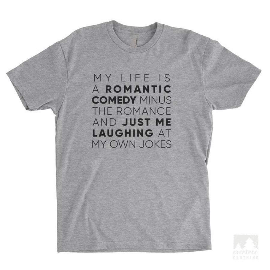 So whether you're looking to show off your own name or create a personalized gift for someone special, LateAndLow Store has got you covered. Start designing your own custom My Life Is A Romantic Comedy Minus The Romance T-shirt or Tank Top print-on-demand product today, and let us bring your vision to life!