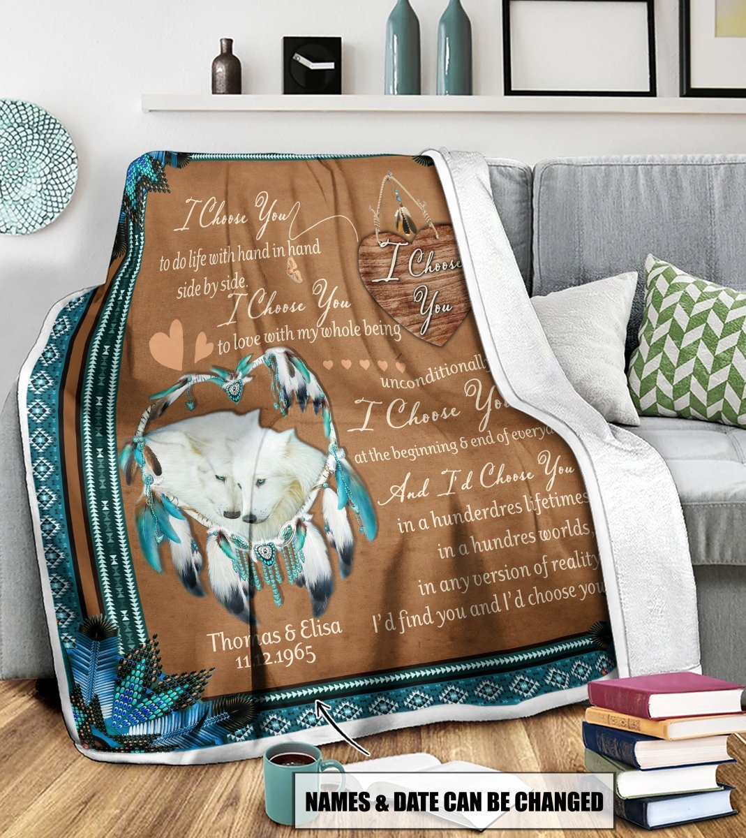 So whether you're looking to show off your own name or create a personalized gift for someone special, LateAndLow Store has got you covered. Start designing your own custom Native America Couple Wolf Personalized Name And Date Quilt Blanket print-on-demand product today, and let us bring your vision to life!