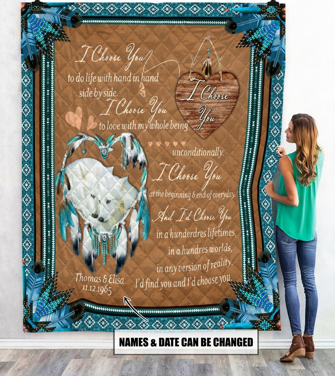 At Cotenis Store, we offer a fantastic range of print-on-demand products that can be personalized with your name. Our Native America Couple Wolf Personalized Name And Date Quilt Blanket print-on-demand products are the perfect way to add a personal touch to your wardrobe or to create a unique and thoughtful gift for someone special.