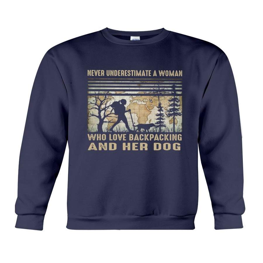 Never Underestimate A Woman Love Backpacking And Her Dog Sweatshirt