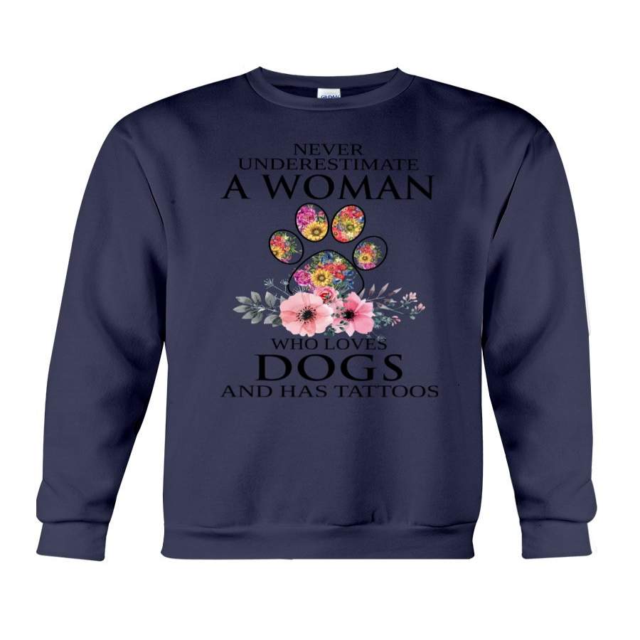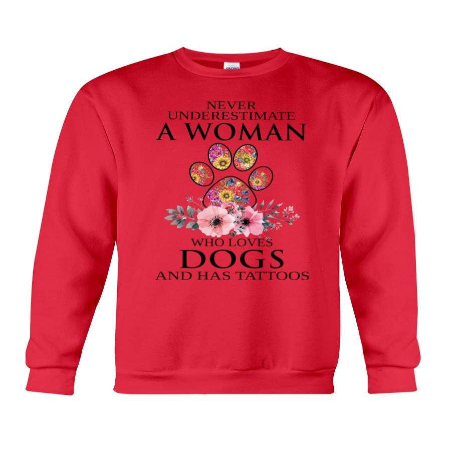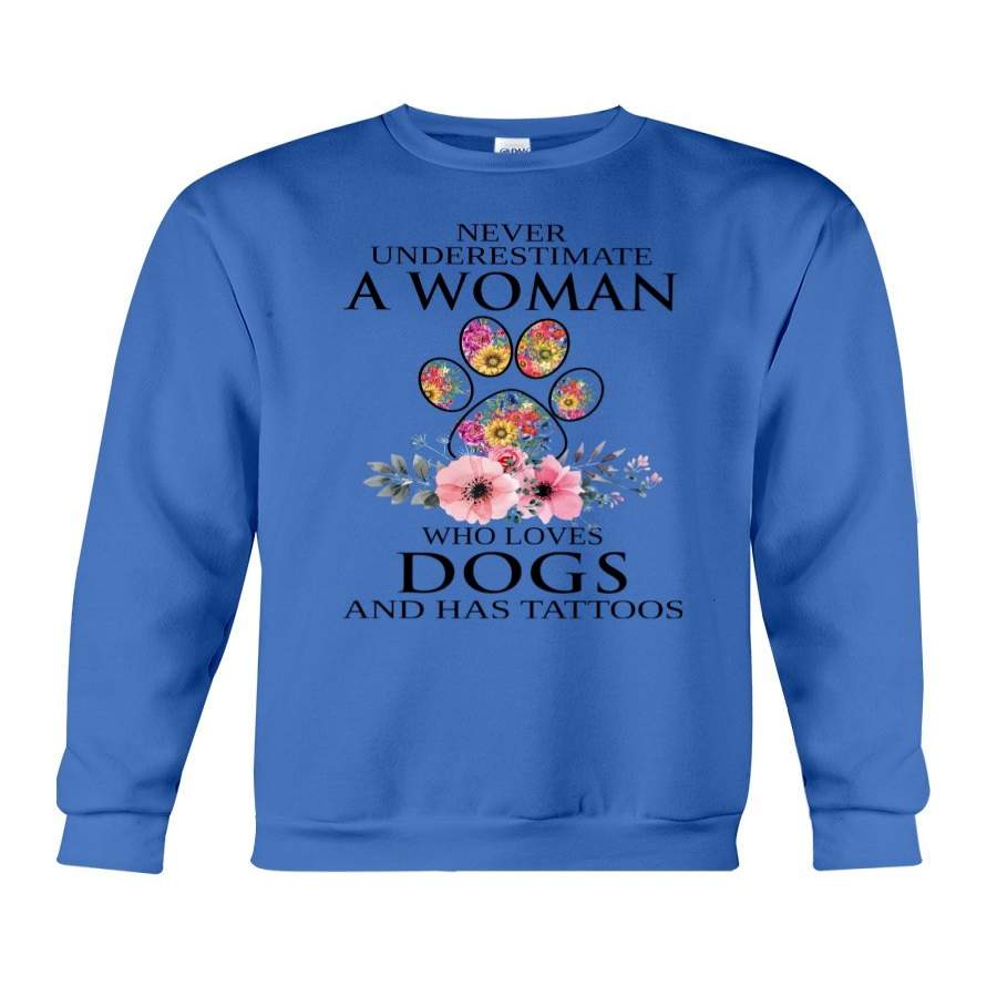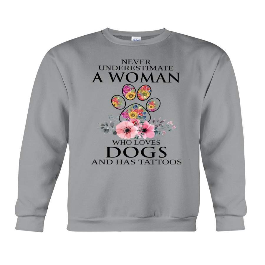 Never Underestimate A Woman Who Loves Dogs Has Tattoos Sweatshirt