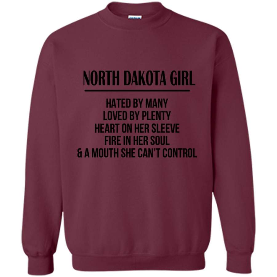 North Dakota Girl Hated By Many Loved By Plenty Heart On Her Sleeve Fire In Her Soul A Mouth She Can’t Control – Gildan Crewneck Sweatshirt