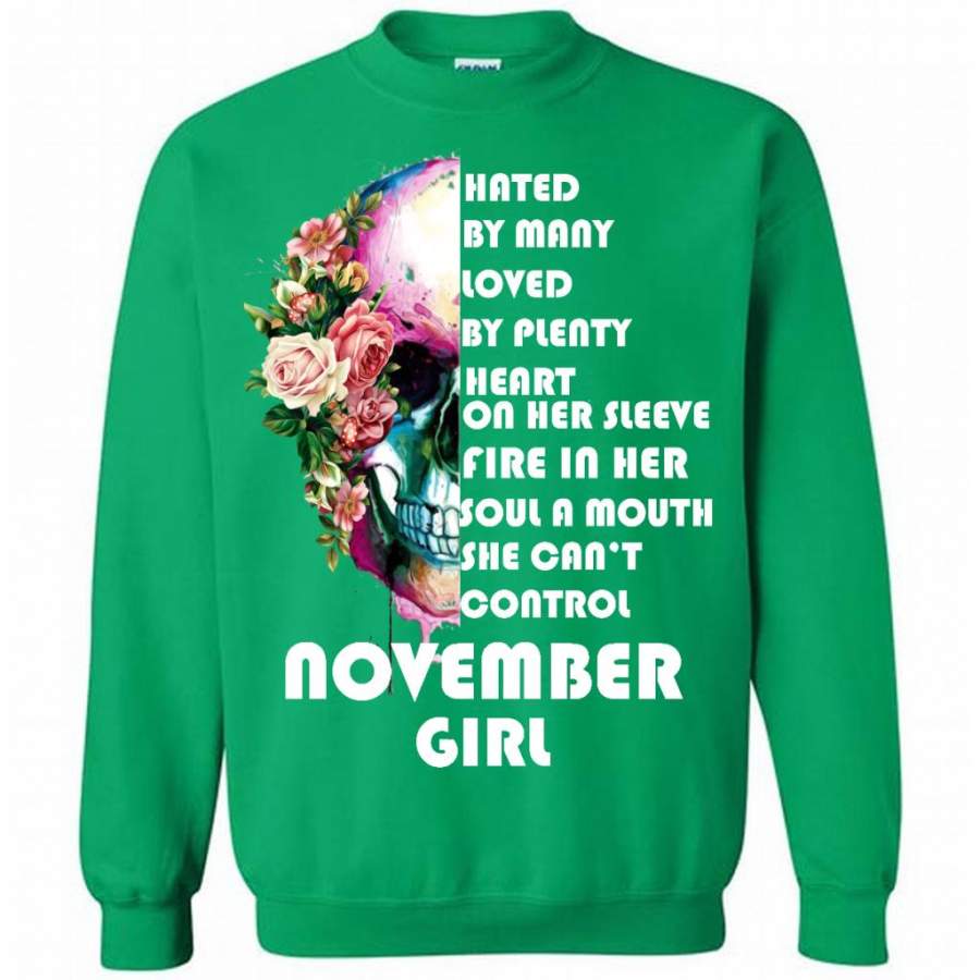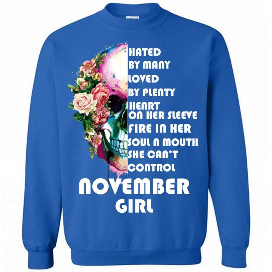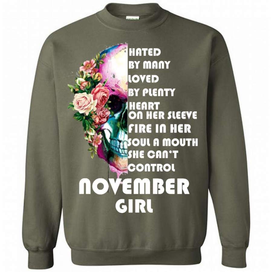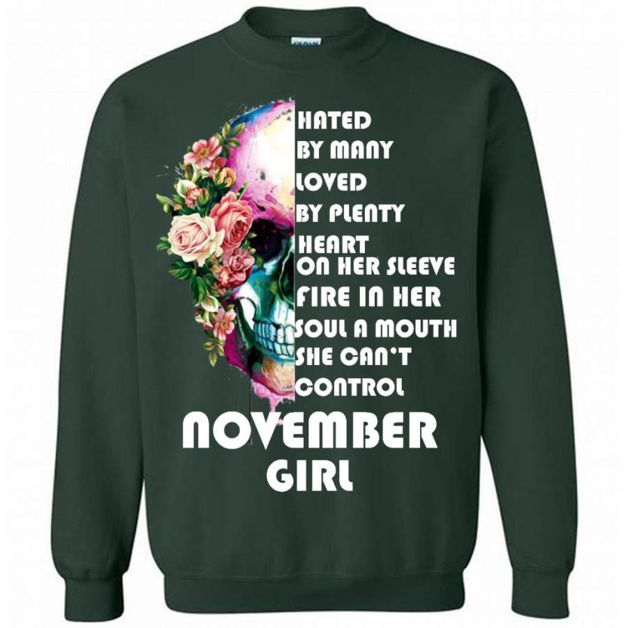 November Girl, Hated By Many Loved By Plenty Heart On Her Sleeve Fire In Her Soul A Mouth She Can’t Control – Gildan Crewneck Sweatshirt