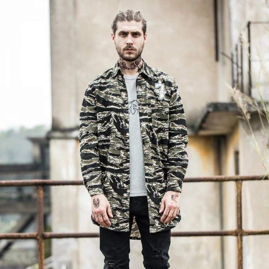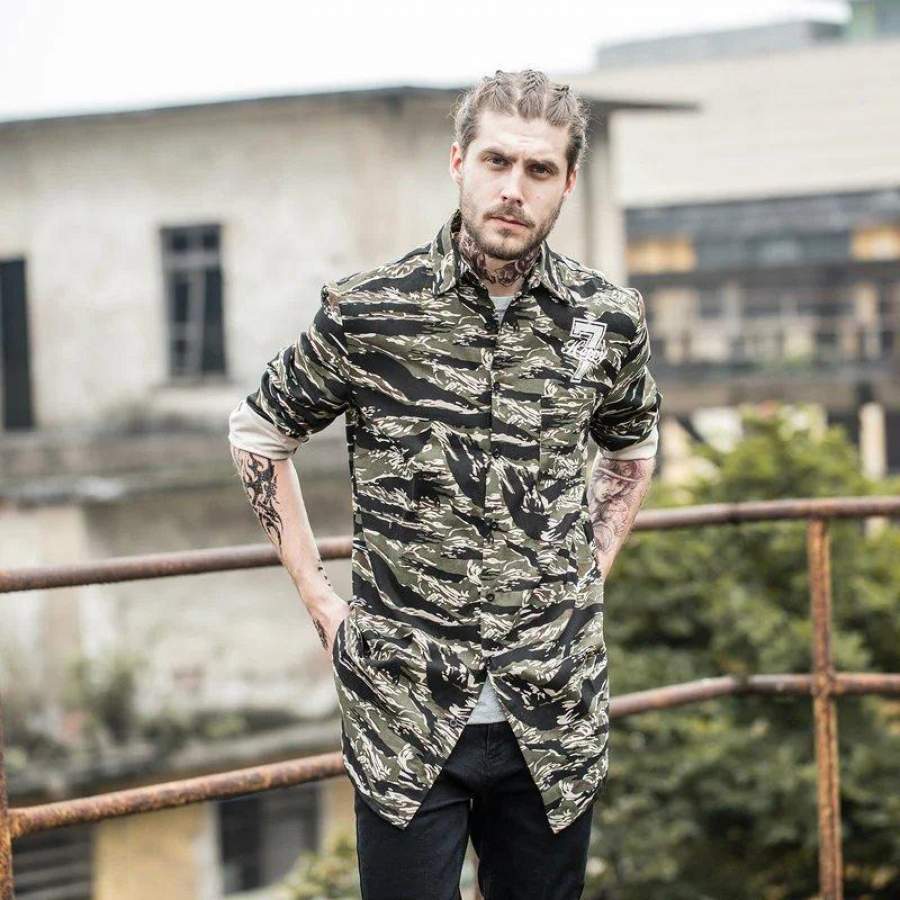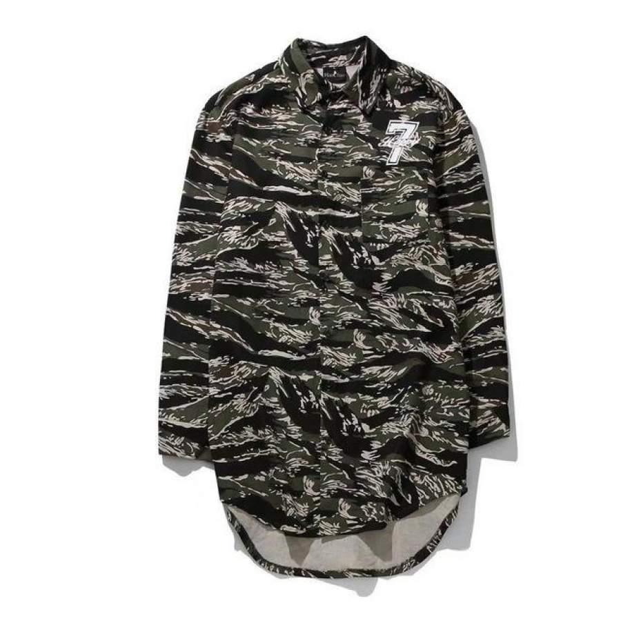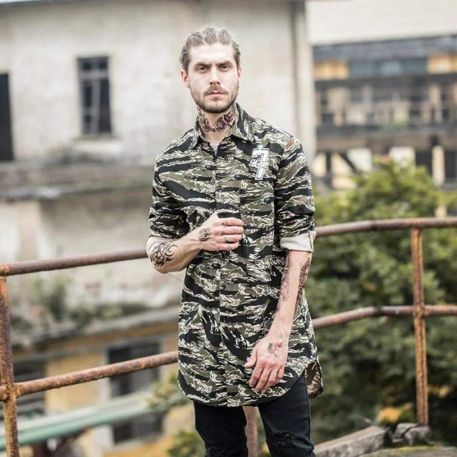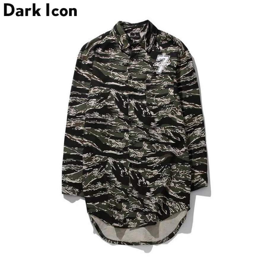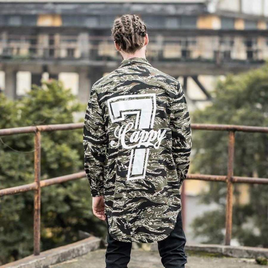 Number 7 Printed Camouflage Elongated Hipster Men’s Shirt Long Sleeve Summer Curved Hem Long line Hip Hop Shirts Men