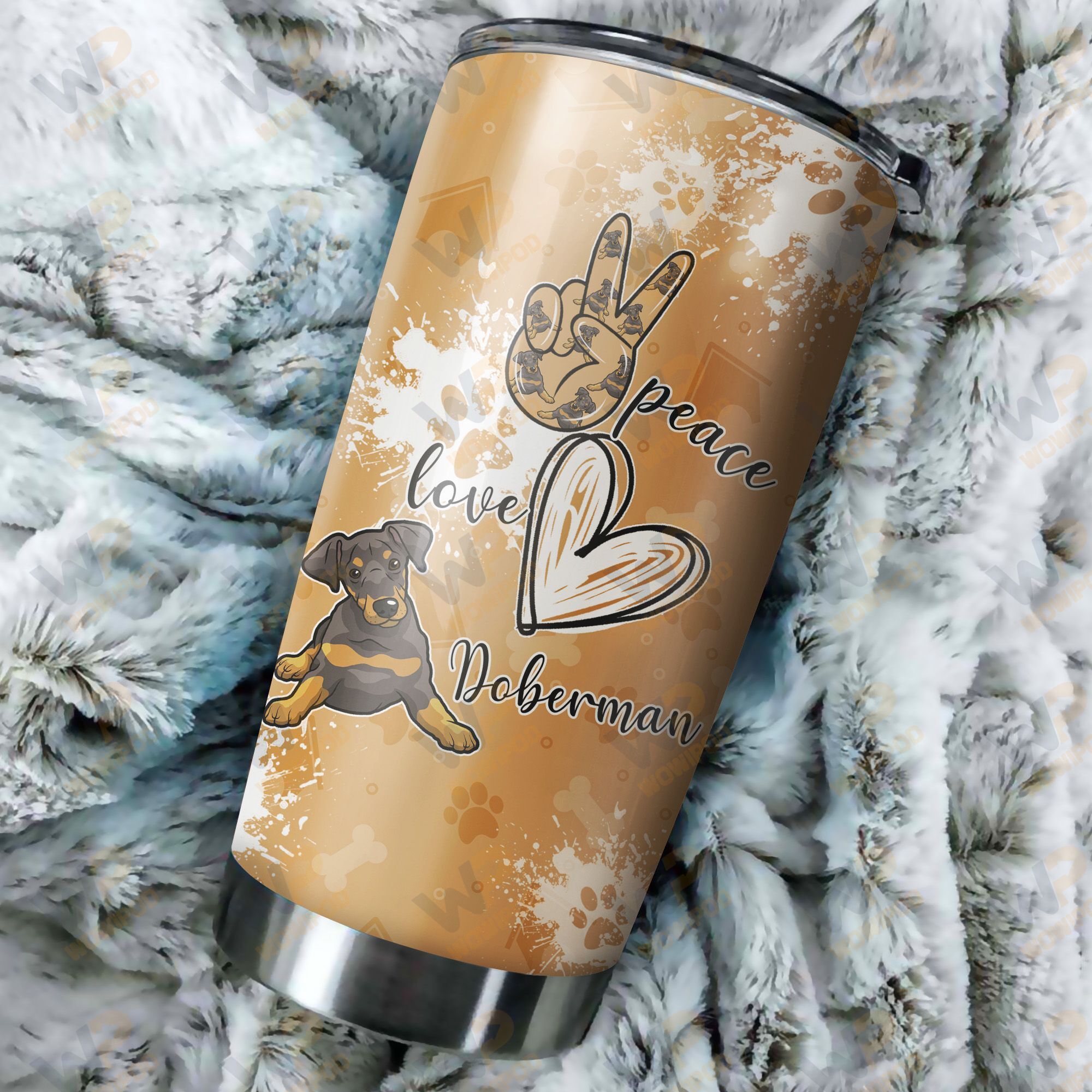 At Cotenis Store, we offer a fantastic range of print-on-demand products that can be personalized with your name. Our Peace love Doberman, 20 oz stainless steel tumbler cup for dog lover print-on-demand products are the perfect way to add a personal touch to your wardrobe or to create a unique and thoughtful gift for someone special.