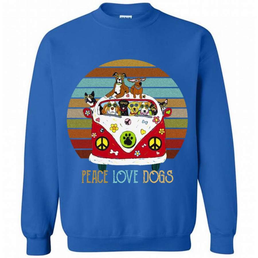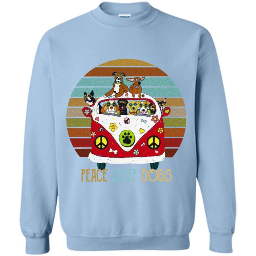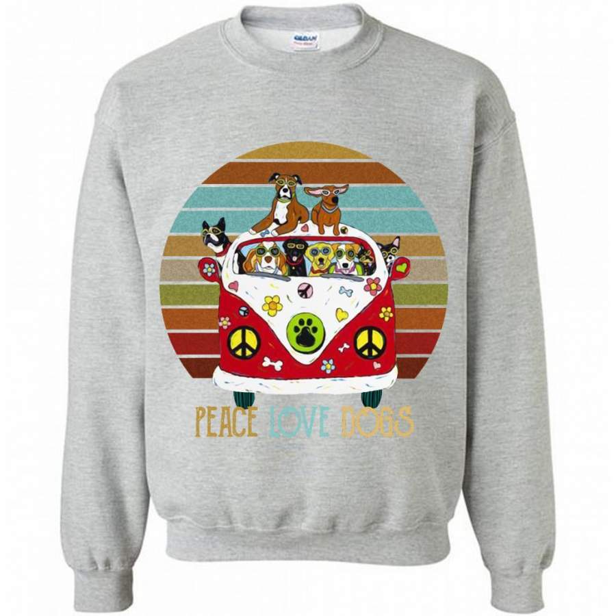 So whether you're looking to show off your own name or create a personalized gift for someone special, LateAndLow Store has got you covered. Start designing your own custom Peace Love Dogs, Hippie Van, Classic Vintage Retro – Gildan Crewneck Sweatshirt print-on-demand product today, and let us bring your vision to life!