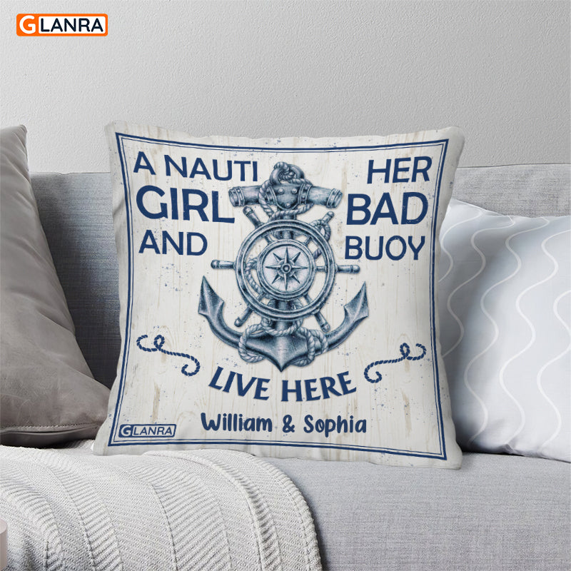 Personalized A Nauti Girl And Her Bad Buoy Live Here Pillow, Custom Sailor Couple Pillow, Sailor Pillow, Couple Pillow (Insert Included)