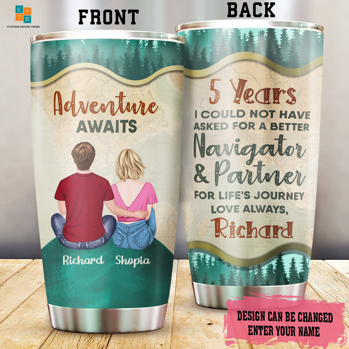 So whether you're looking to show off your own name or create a personalized gift for someone special, LateAndLow Store has got you covered. Start designing your own custom Personalized Adventure Awaits 5 Year Navigator & Partner Stainless Steel Tumbler, Custom Couple Stainless Steel Tumbler print-on-demand product today, and let us bring your vision to life!
