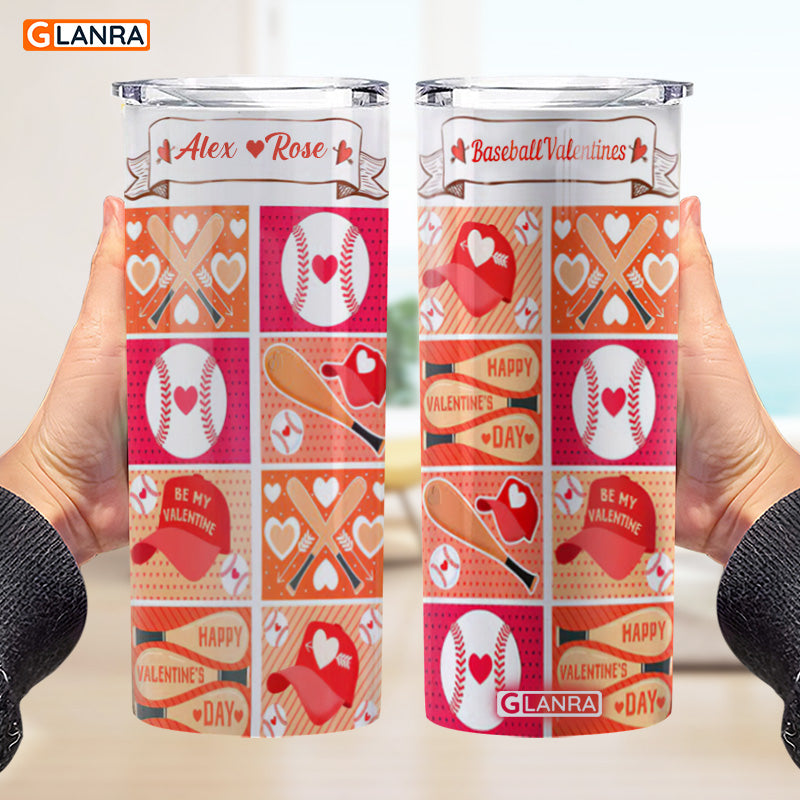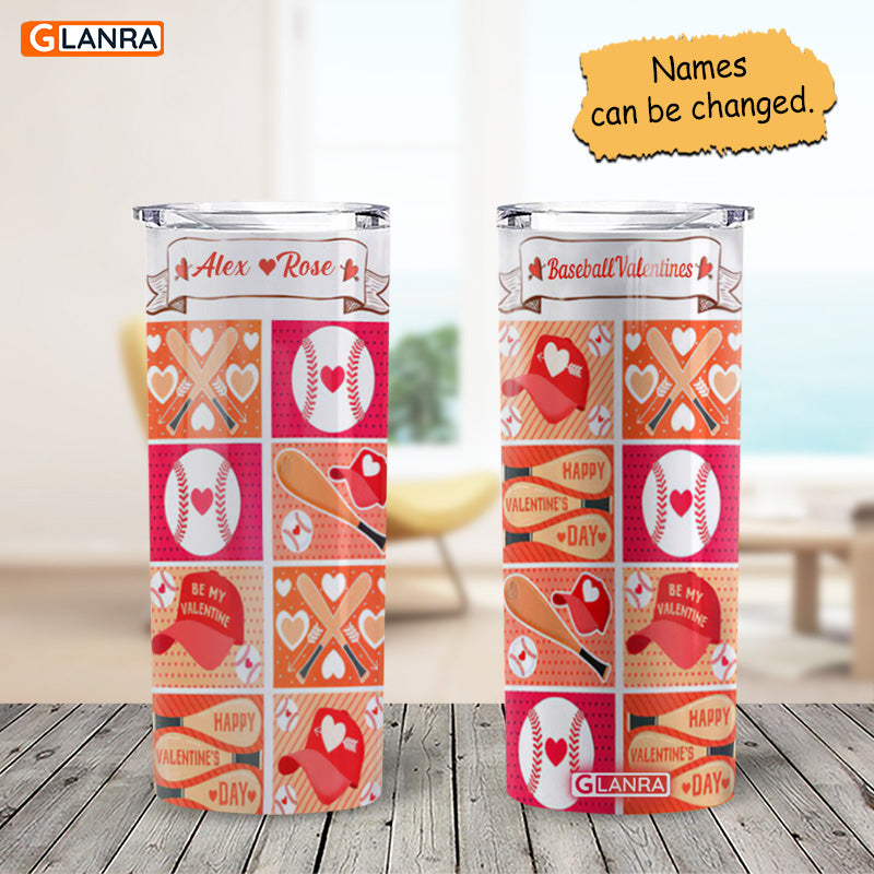 Personalized Baseball Valentines Skinny Tumbler, Custom Baseball Couple Tumbler, Glitter Water Bottle, Stainless Steel Tumbler, Metal, Insulated
