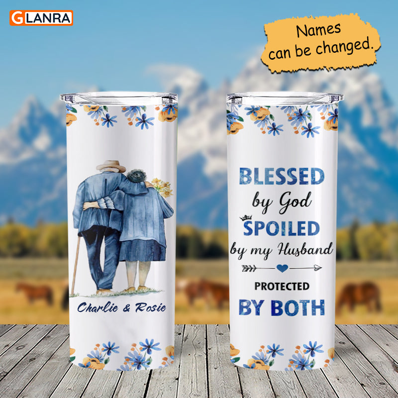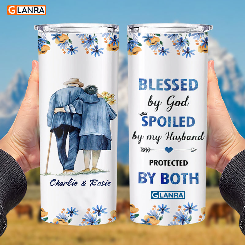 Personalized Blessed By God Spoiled By My Husband Skinny Tumbler, Custom Old Couple Stainless Steel, Water Bottle, Glitter, Metal, Insulated, Tumbler